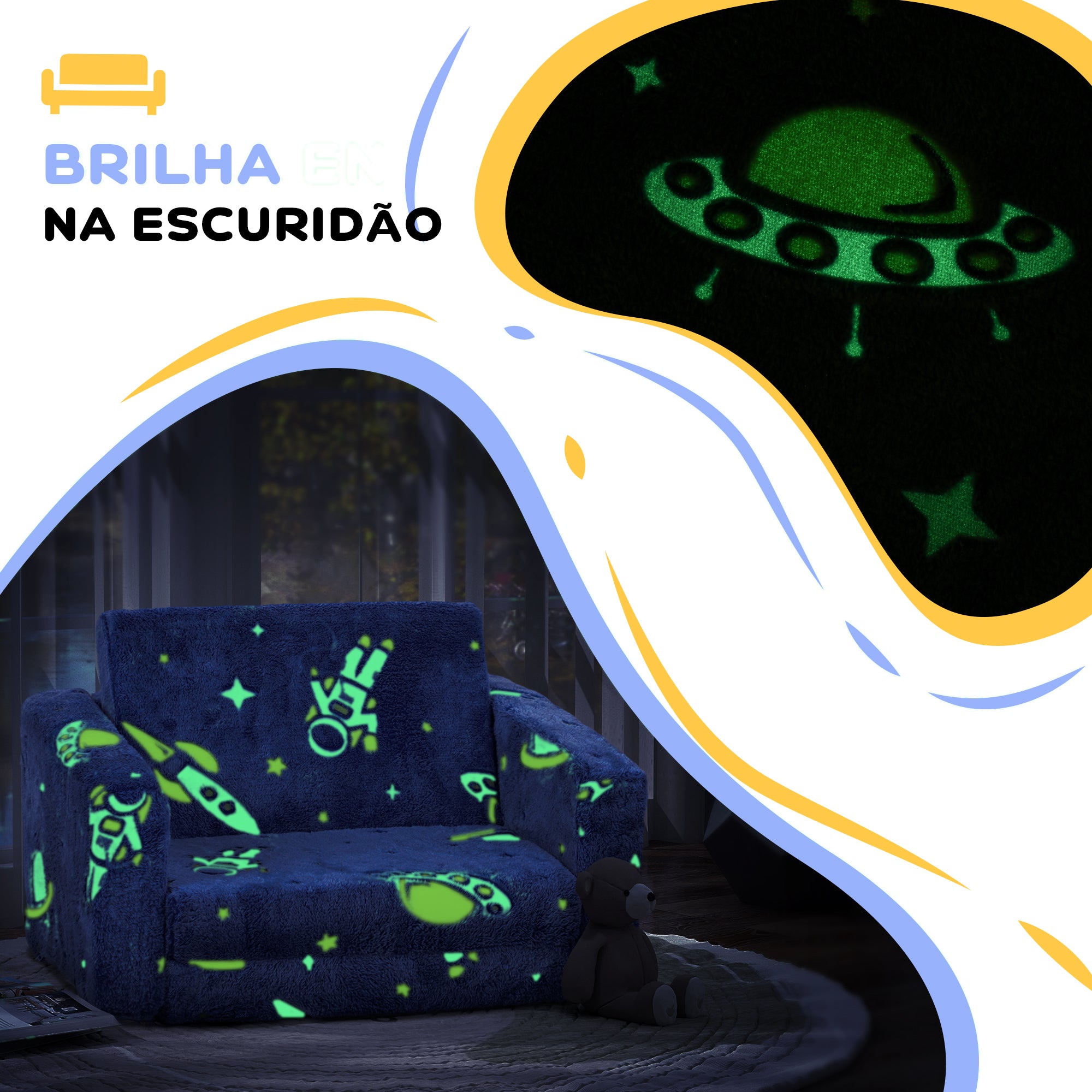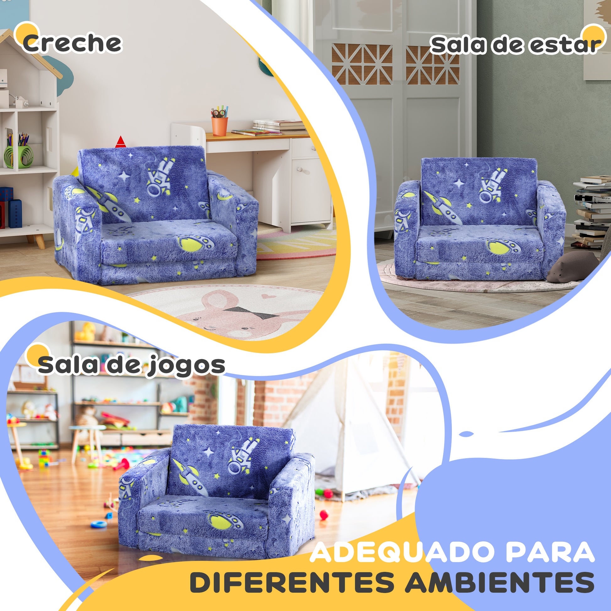 Encante os mais pequenos com esta poltrona infantil azul, com tecido luminoso e desenho cósmico. Ideal para o quarto, creche ou sala de estar, oferecendo conforto e praticidade em qualquer ambiente.