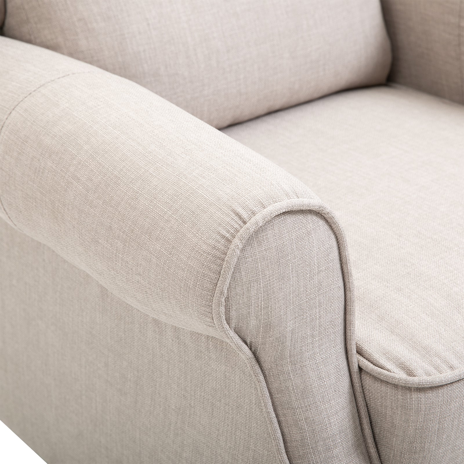 - Materiais: Tecido semelhante ao linho, metal, madeira de borracha e espuma
