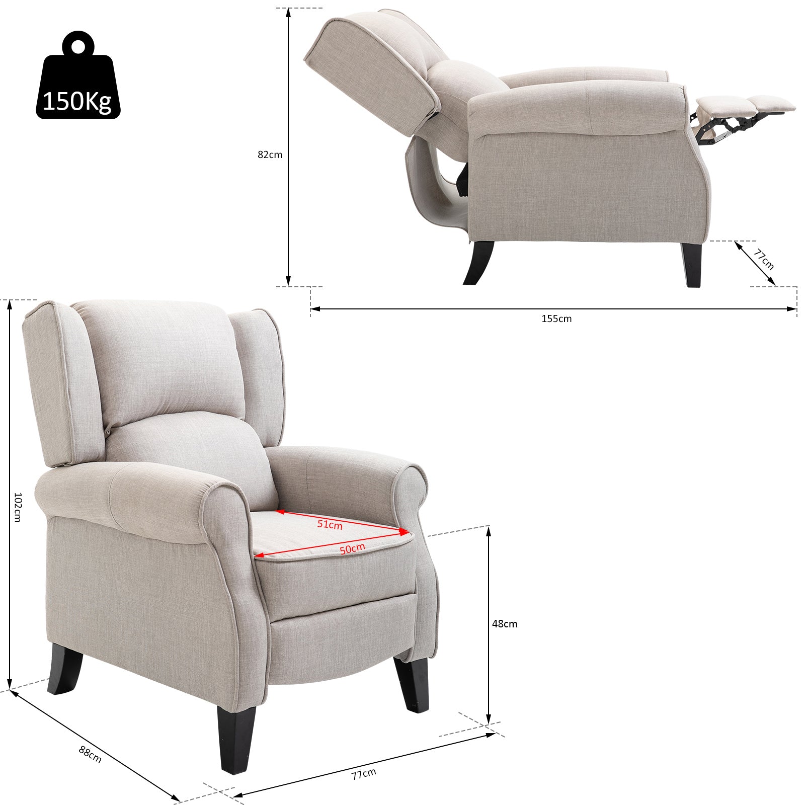 - Outras especificações: Ângulo de reclinação de até 160°; capacidade máxima de carga de 150 kg; requer montagem