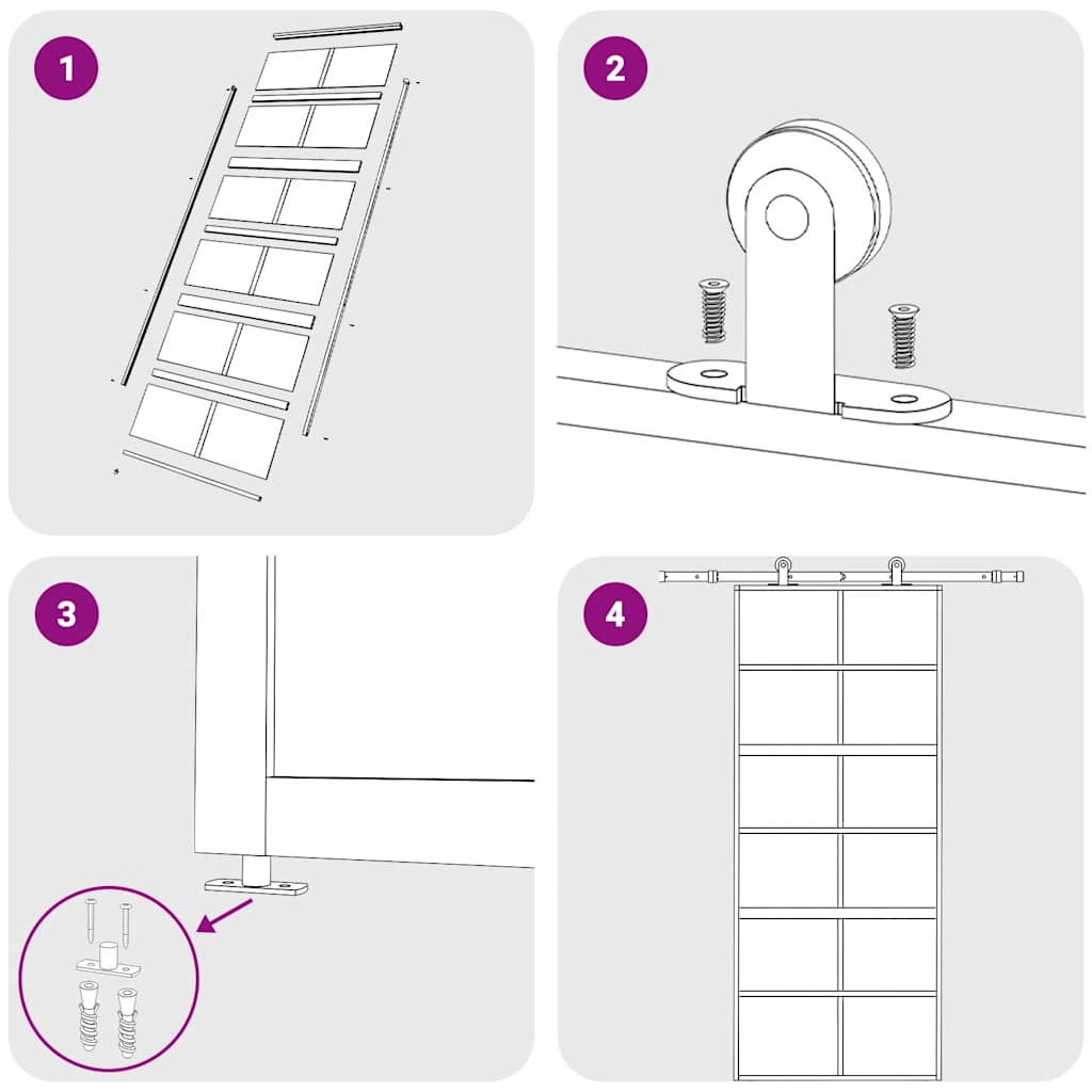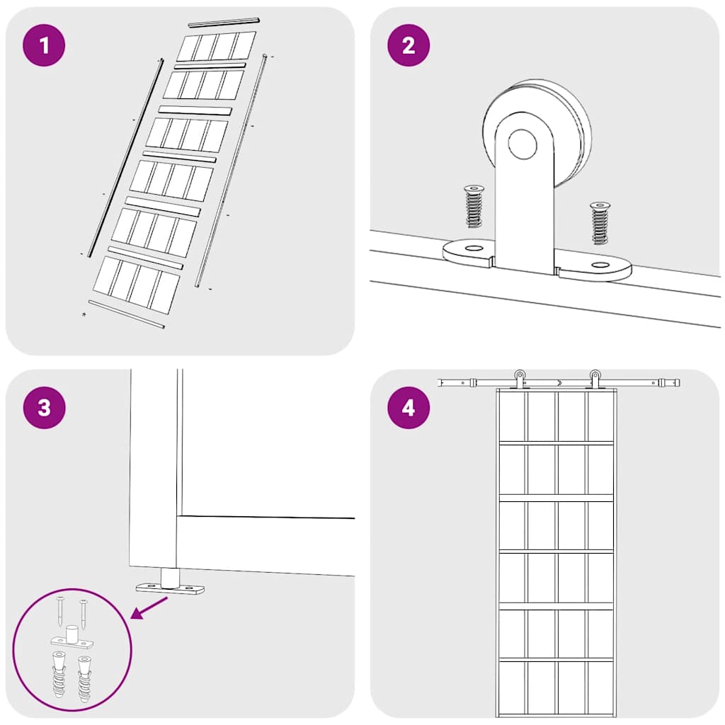 - A porta só pode ser montada utilizando-se kits de ferragens de portas deslizantes. Pode encontrar os kits de ferragens para portas deslizantes correspondentes na nossa loja.