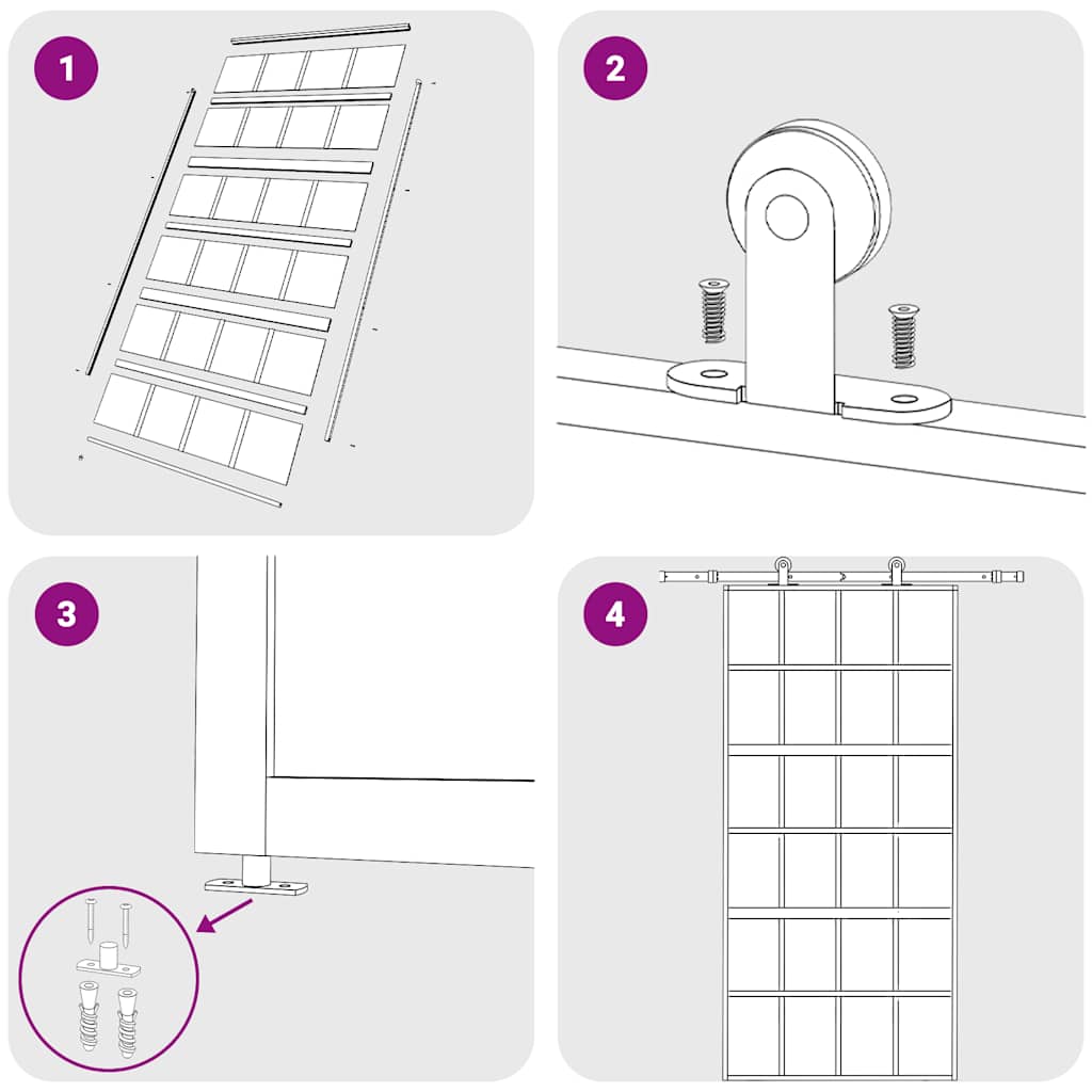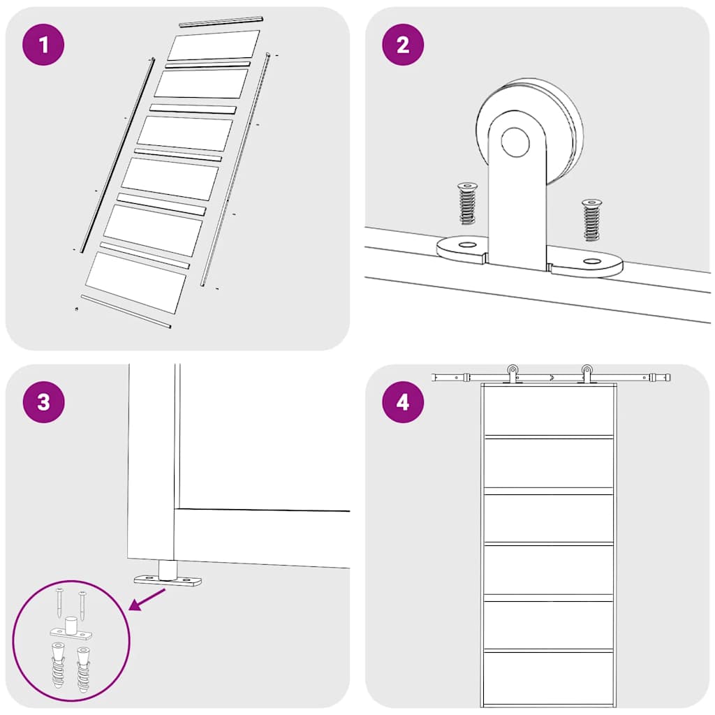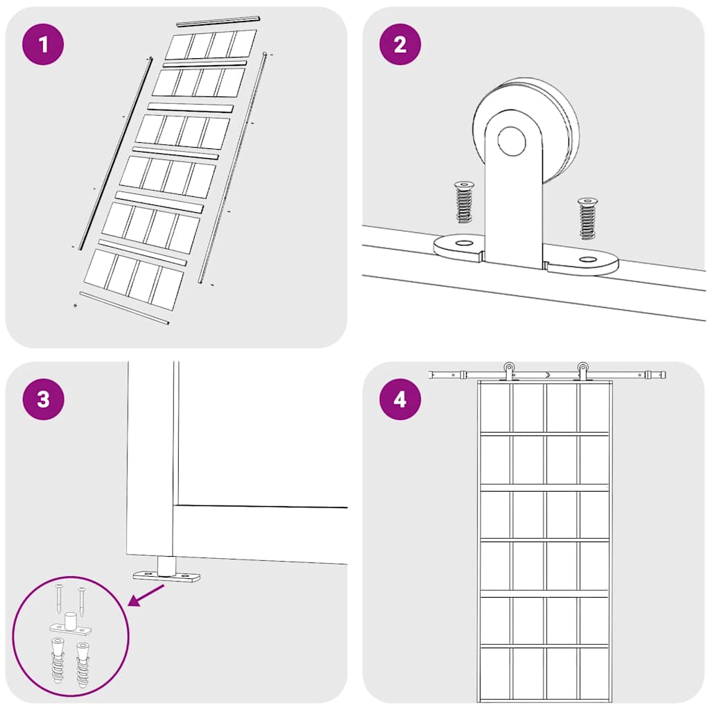 - A porta só pode ser montada utilizando-se kits de ferragens de portas deslizantes. Pode encontrar os kits de ferragens para portas deslizantes correspondentes na nossa loja.