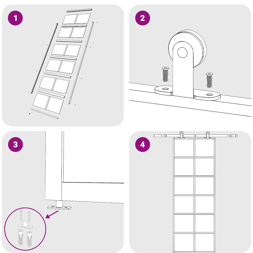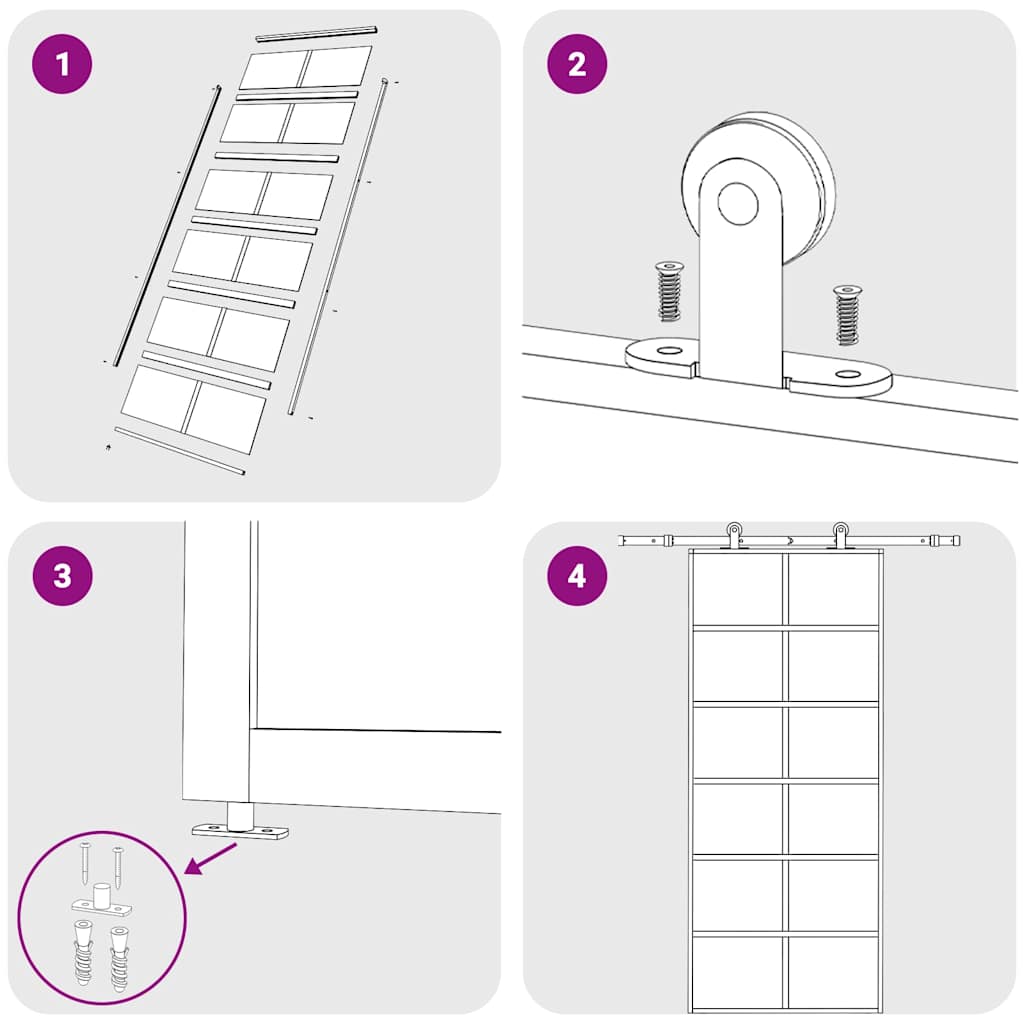 A porta precisa de ser montada com um kit de montagem para portas de correr. Pode encontrar o kit correspondente para portas de correr na nossa loja (SKU: 145262-145263). Para mais informações sobre a instalação, pode consultar o nosso manual de instalação da porta e dos kits para portas de correr.