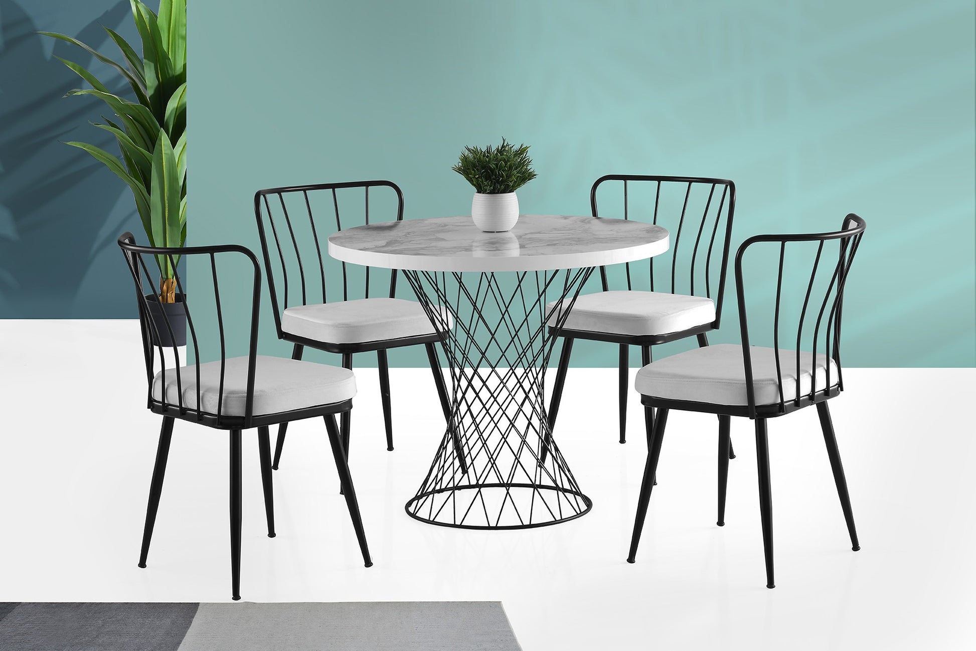 A nossa mesa de jantar é uma verdadeira obra-prima, com uma combinação espantosa de cores branca, cinzenta e preta. Esta mistura única dá um toque contemporâneo à sua sala de jantar, complementando sem esforço qualquer estilo de interior e esquema de cores.