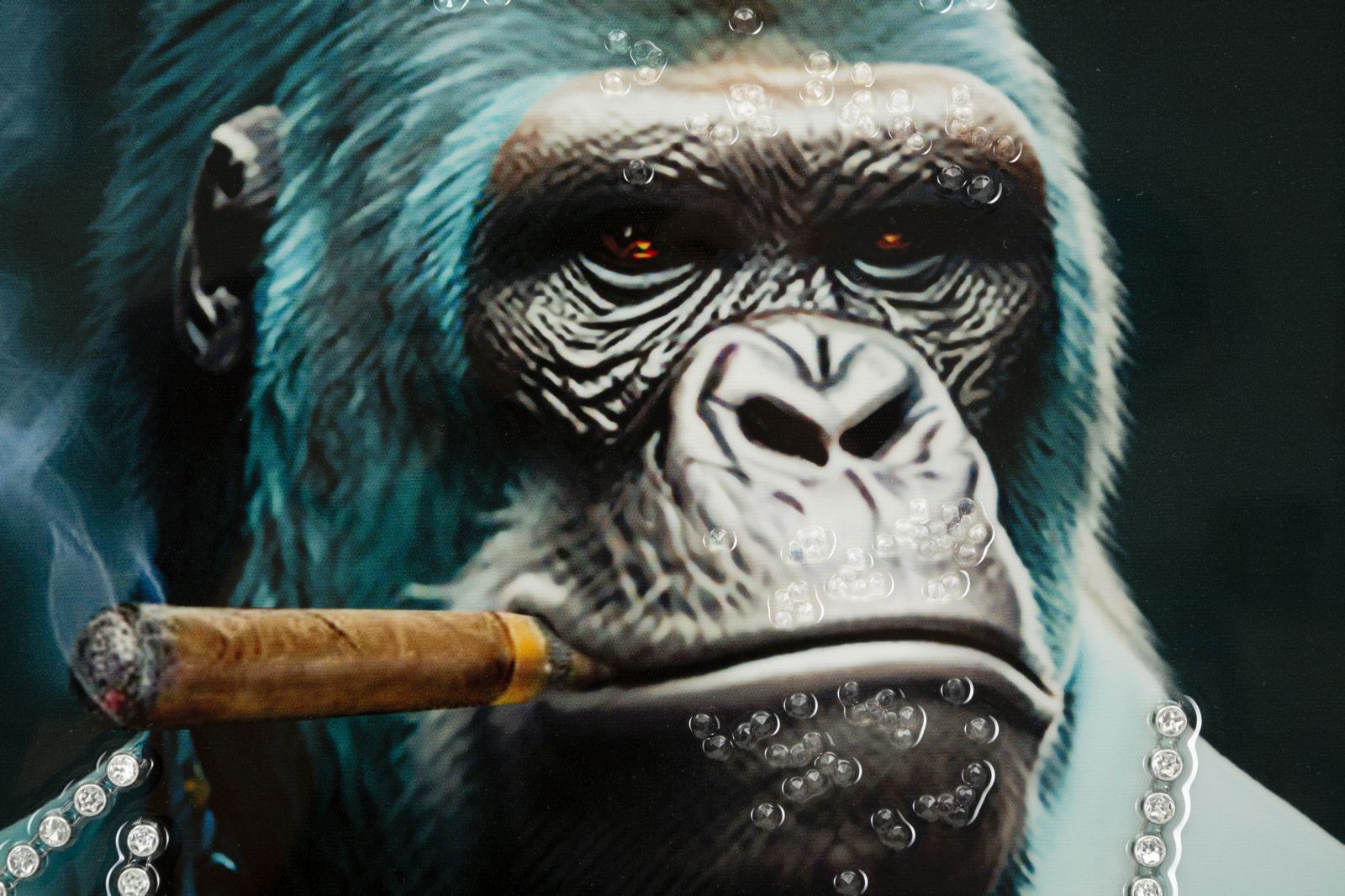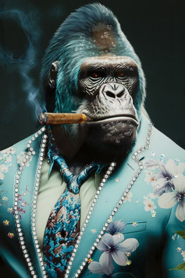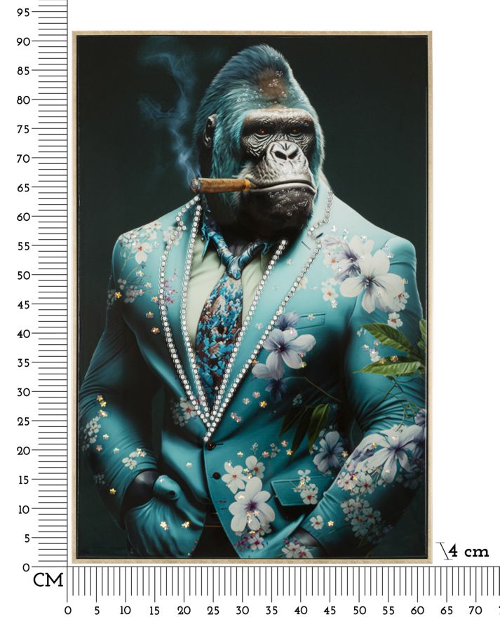 Descubra a sofisticação do quadro em tela MODERN, onde a arte se funde com o design contemporâneo. Este impressionante quadro apresenta um gorila a fumar um charuto, vestido com um elegante fato com detalhes em relevo, que oferece um toque de exclusividade a qualquer espaço. Com uma moldura em madeira e um acabamento dourado, esta peça multicolor é fabricada em metal, madeira de abeto e tela, garantindo qualidade e durabilidade. Ideal para transformar o seu ambiente e impressionar os seus convidados.