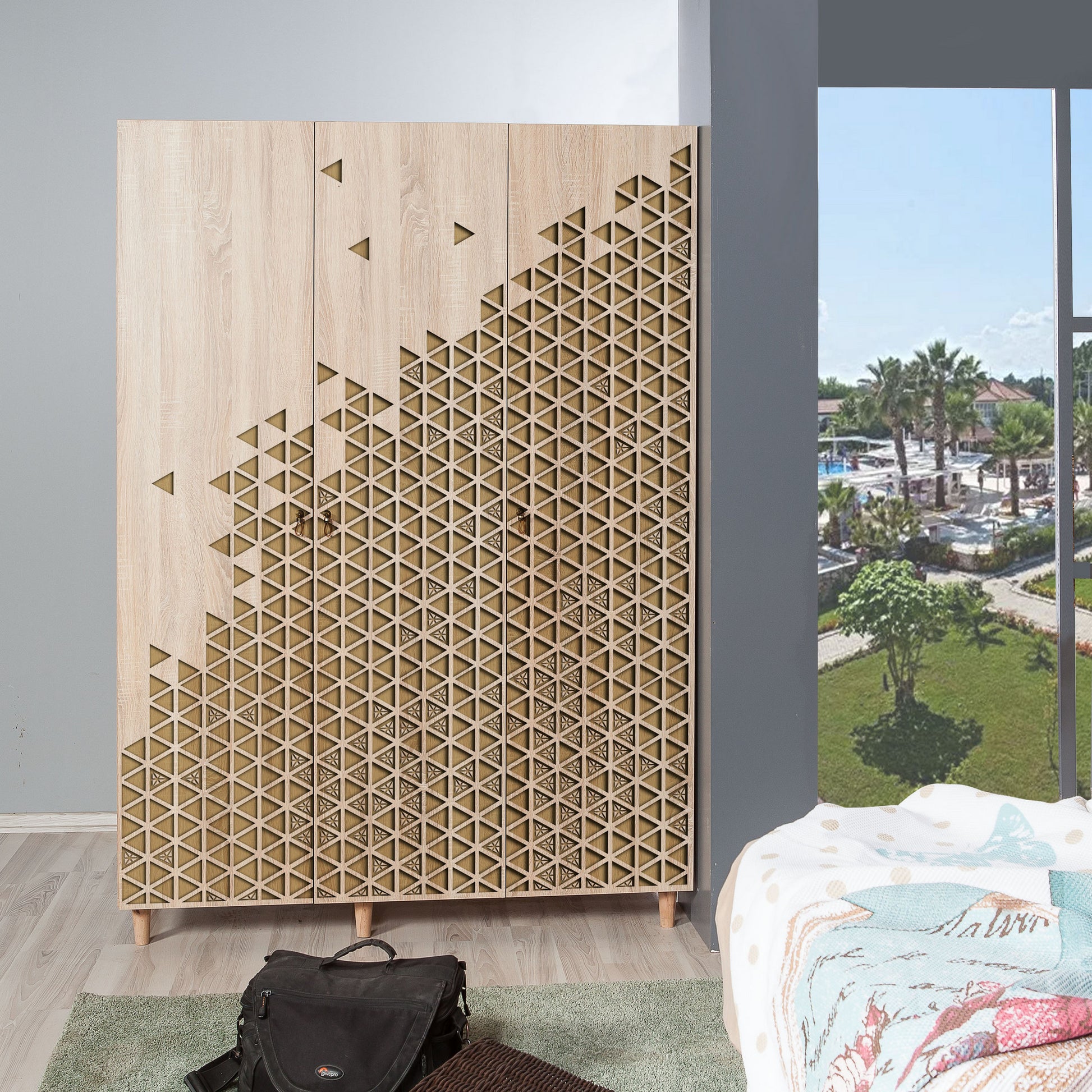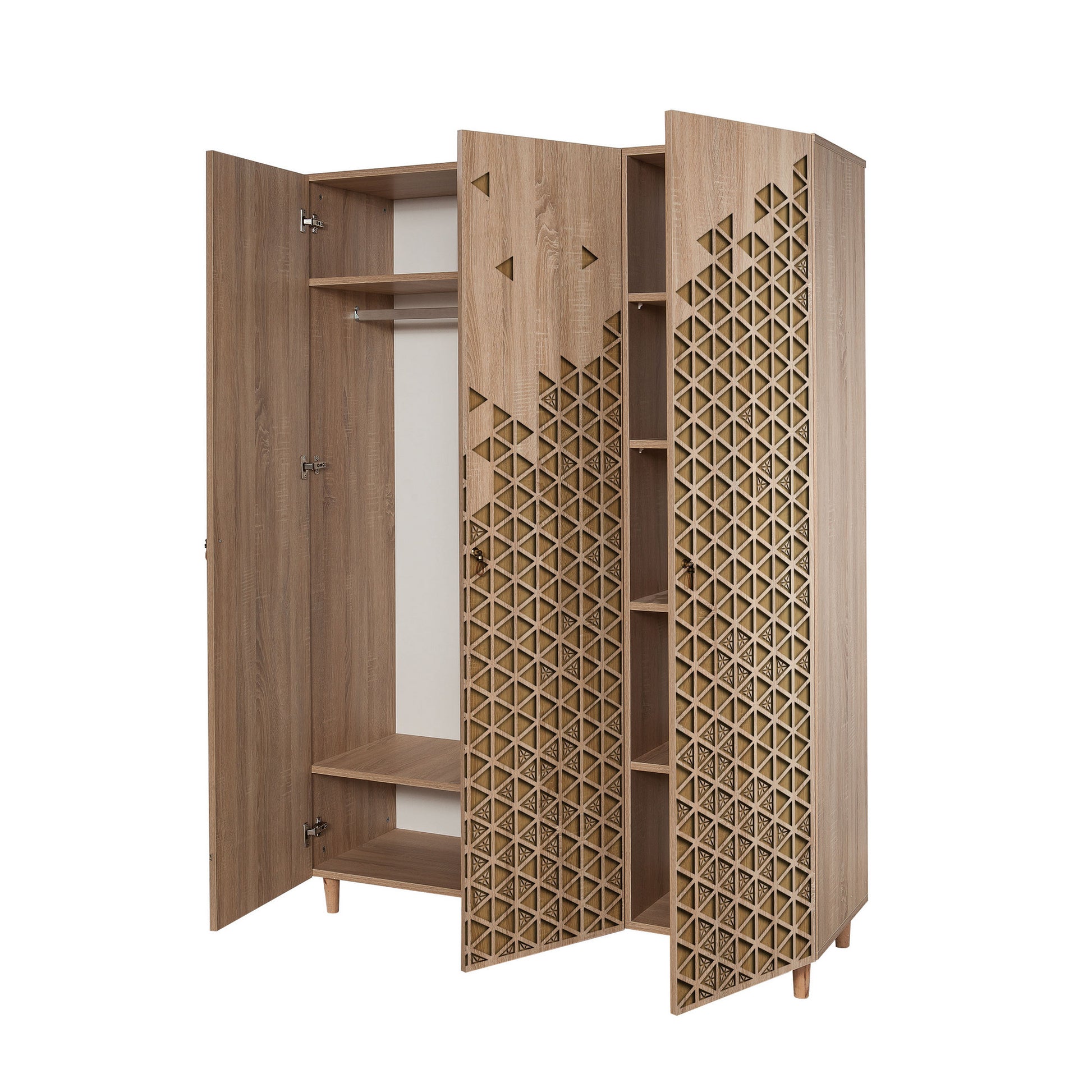 O roupeiro foi concebido numa bonita cor de carvalho sonoma, acrescentando um toque de calor e elegância ao seu espaço. O conceito abstrato e moderno do roupeiro torna-o uma peça versátil que pode combinar na perfeição com vários estilos de interiores, incluindo novidade, sudoeste, argila, geométrico e campestre.