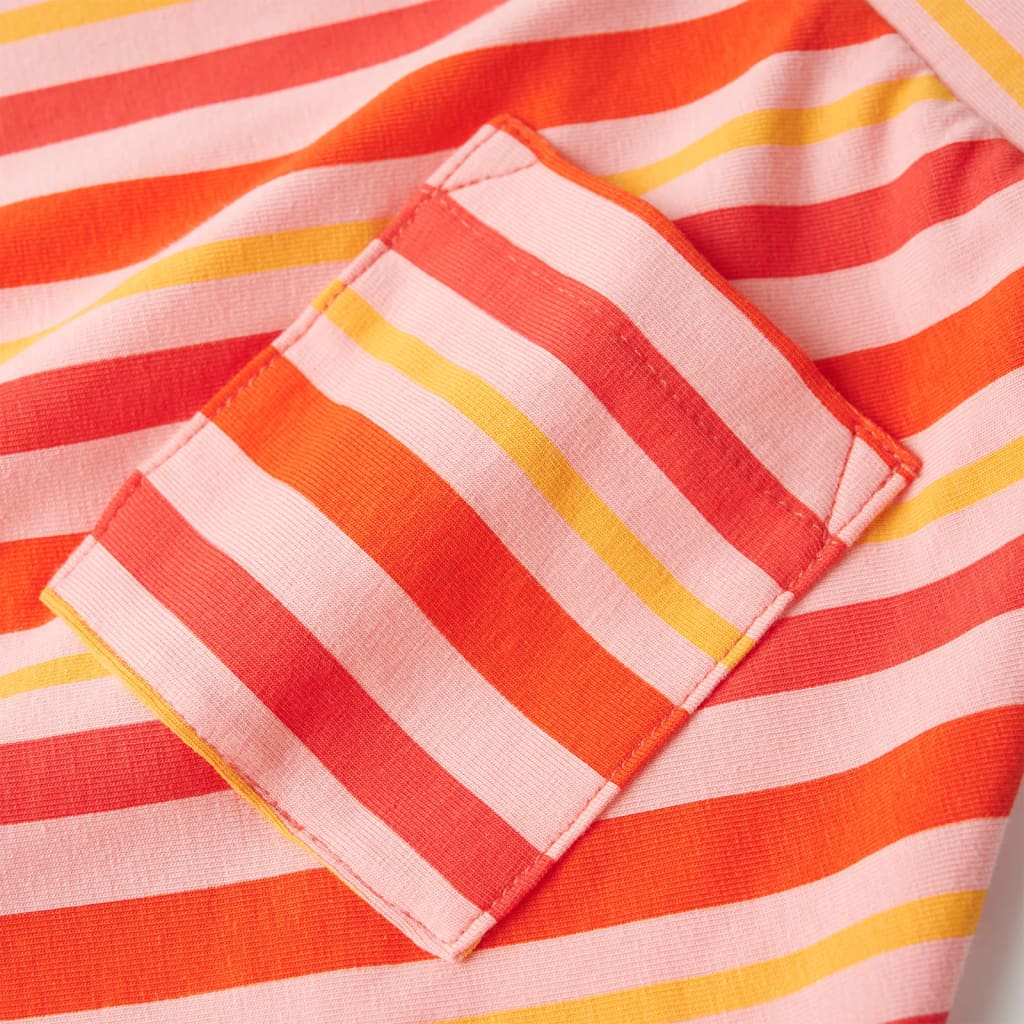 Esta saia infantil possui um corte em A, dois bolsos de chapa e um cós elástico. Esta saia infantil possui uma estampa de riscas por toda parte. A saia para criança é feita de um material macio que inclui 95% de algodão e 5% de elastano, proporcionando conforto e respirabilidade.