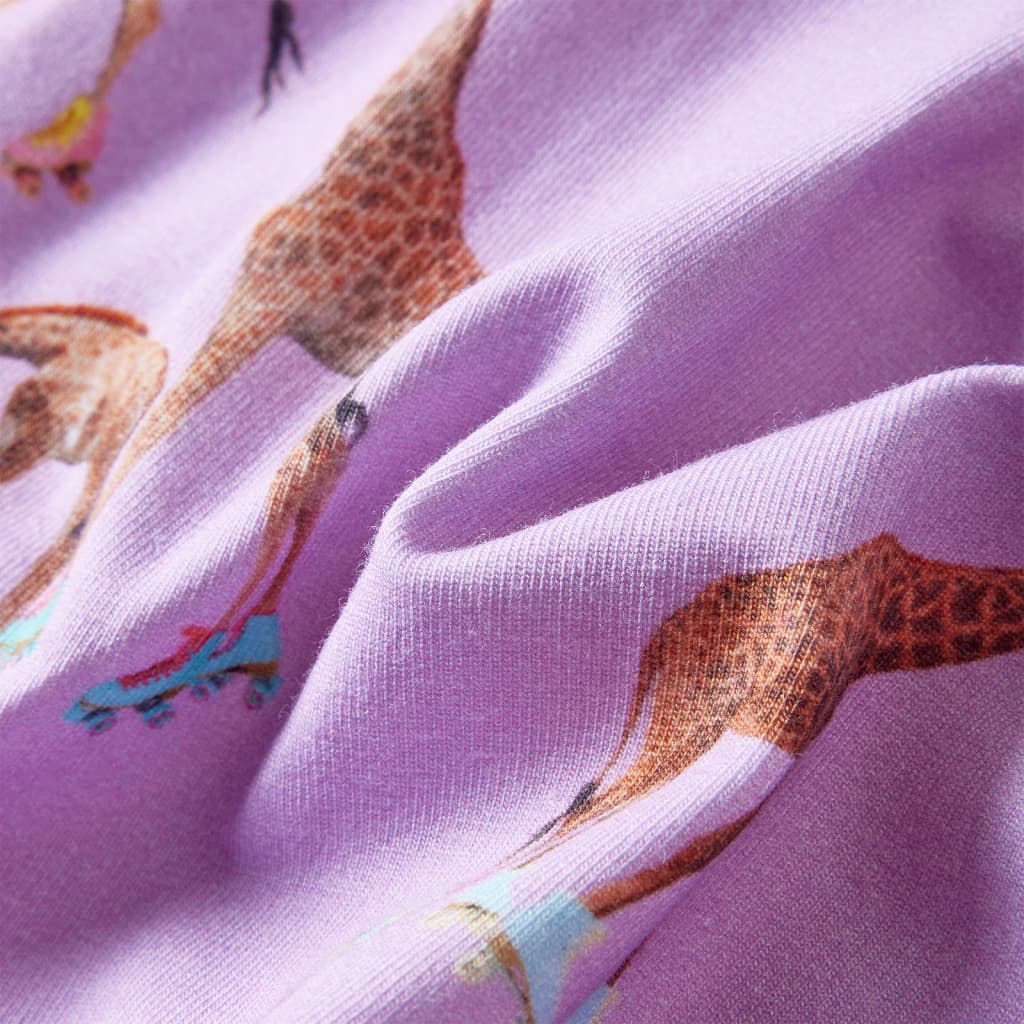 Esta saia para criança possui um design de linha em A e uma cintura elástica. Esta saia infantil possui uma estampa de girafas a andar de patins. A mini-saia para crianças é feita de um material macio que inclui 94% de algodão e 6% de elastano, proporcionando conforto e respirabilidade.
