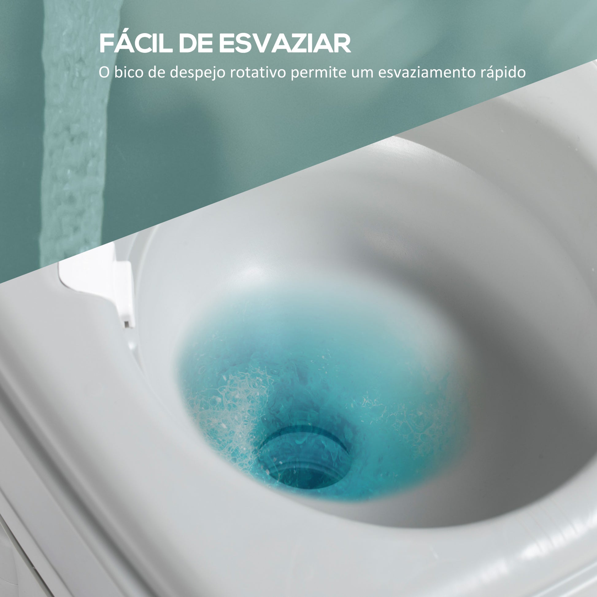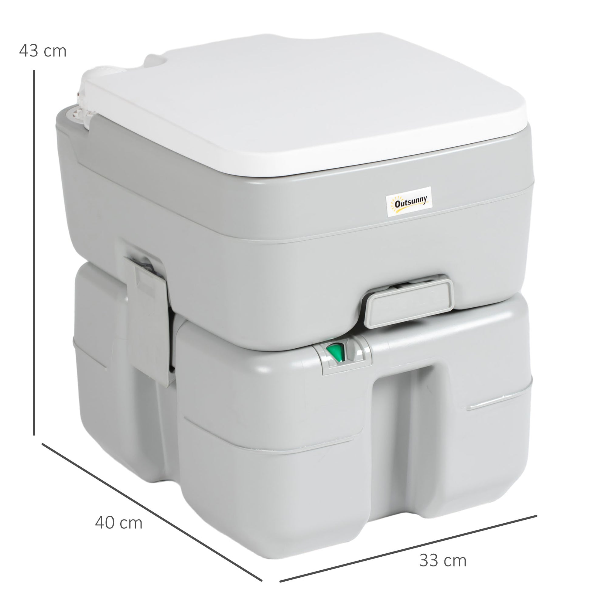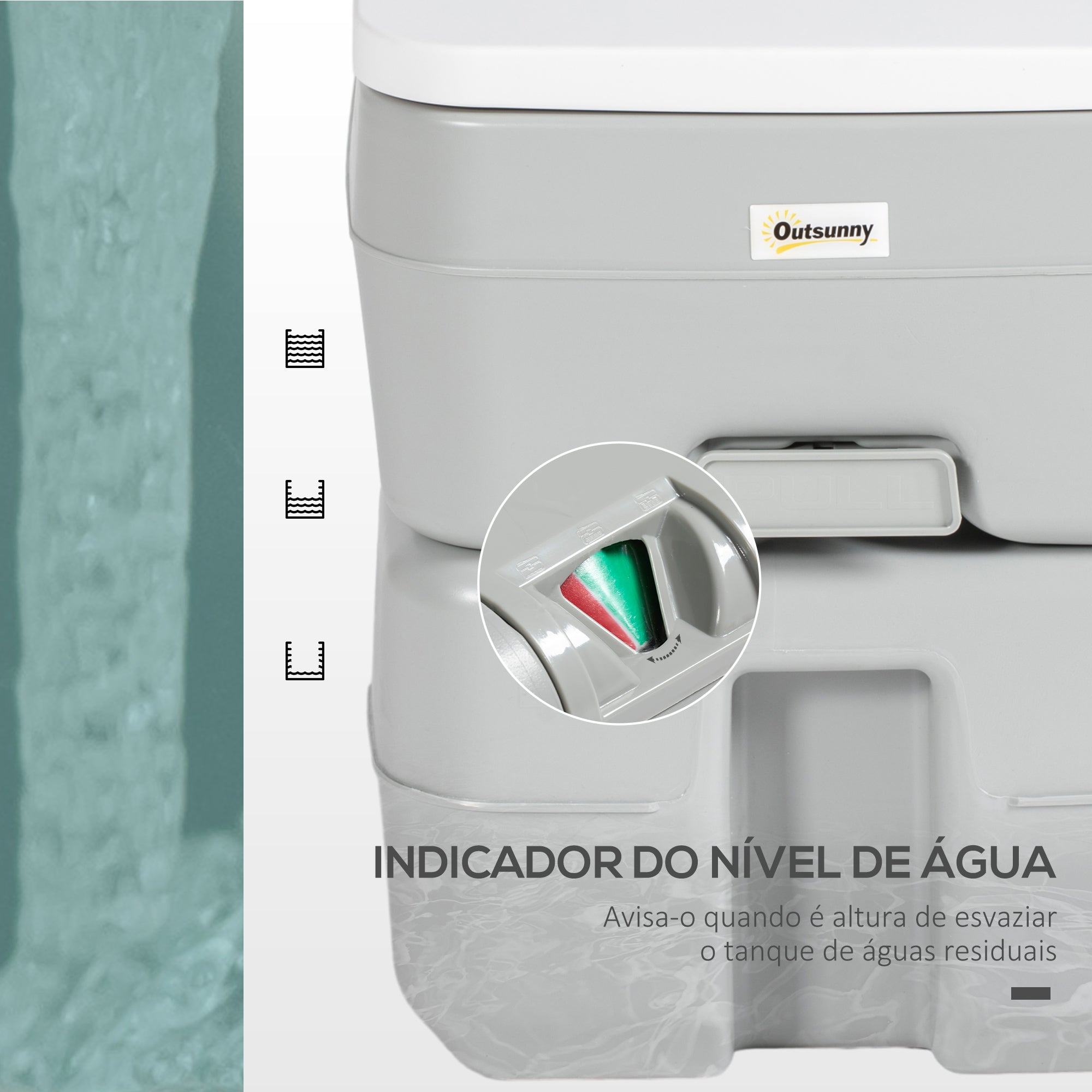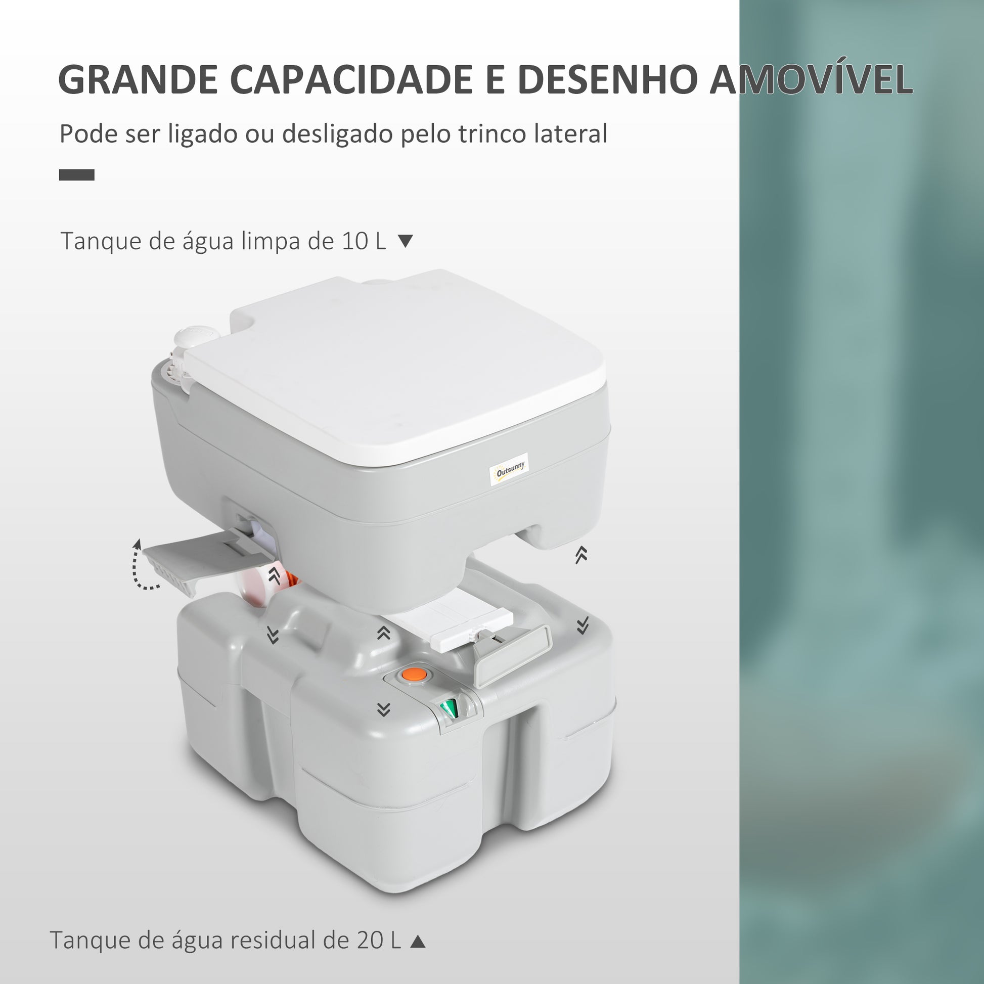 Esta sanita portátil cinzenta é perfeita para campismo, viagens e outras atividades ao ar livre. Com um tanque de água limpa de 10 L e um tanque de águas residuais de 20 L, esta sanita garante o seu uso múltiplo durante viagens.
