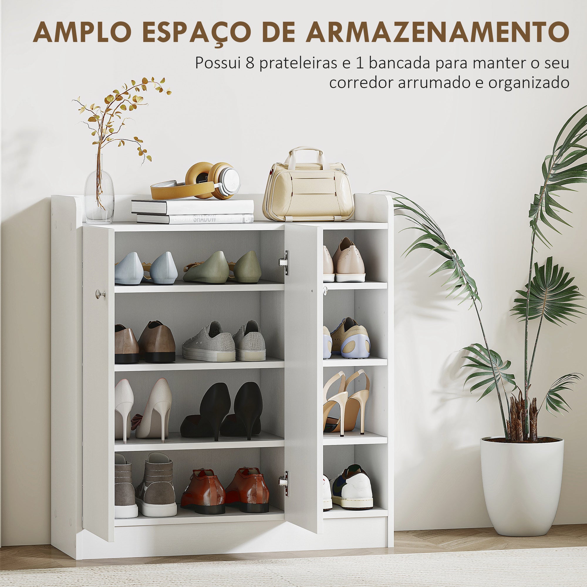 Este sapateira armário multiuso branco é a solução perfeita para manter a sua casa organizada. Com prateleiras interiores e exteriores, oferece um amplo espaço de armazenamento para até 12 pares de sapatos e pequenos objetos.