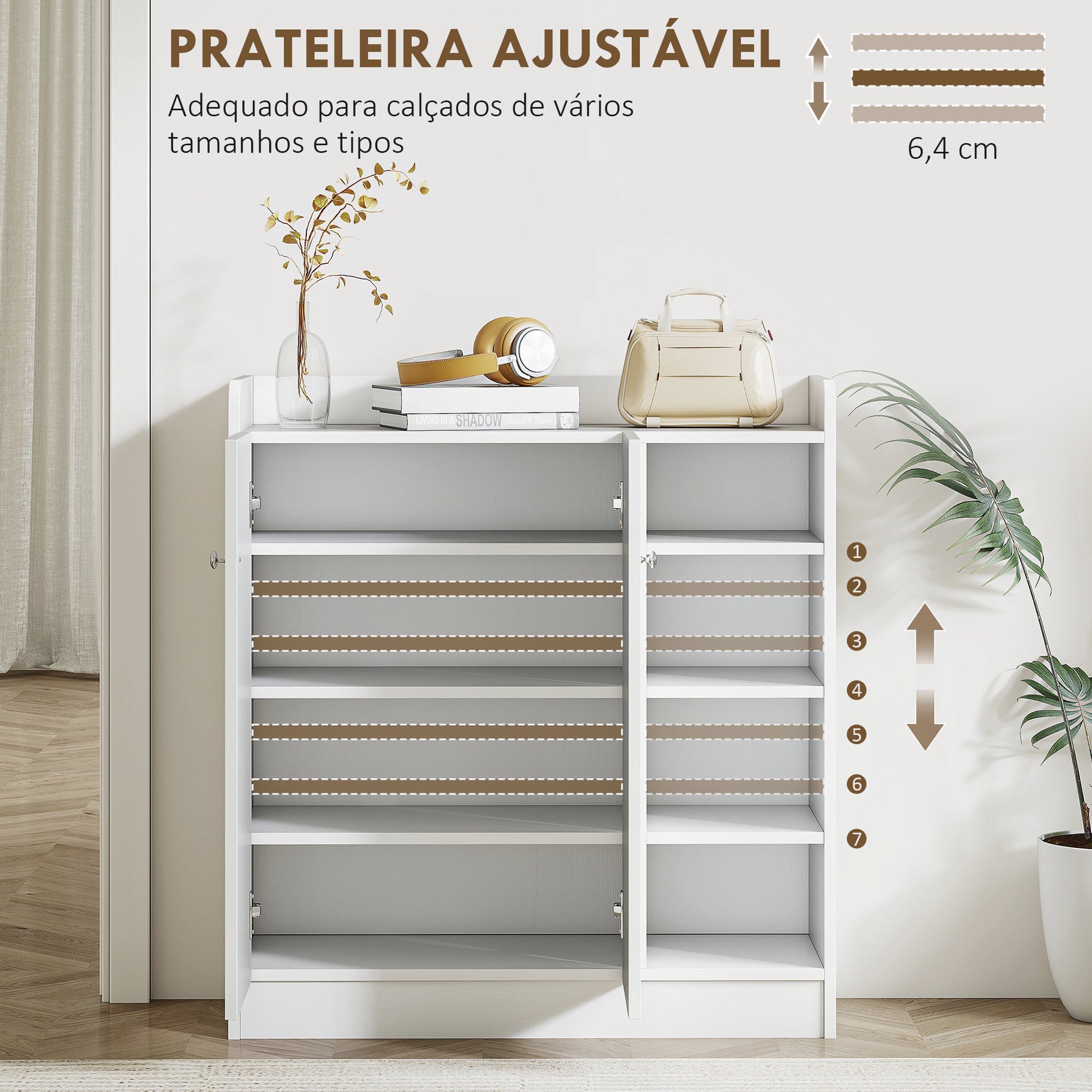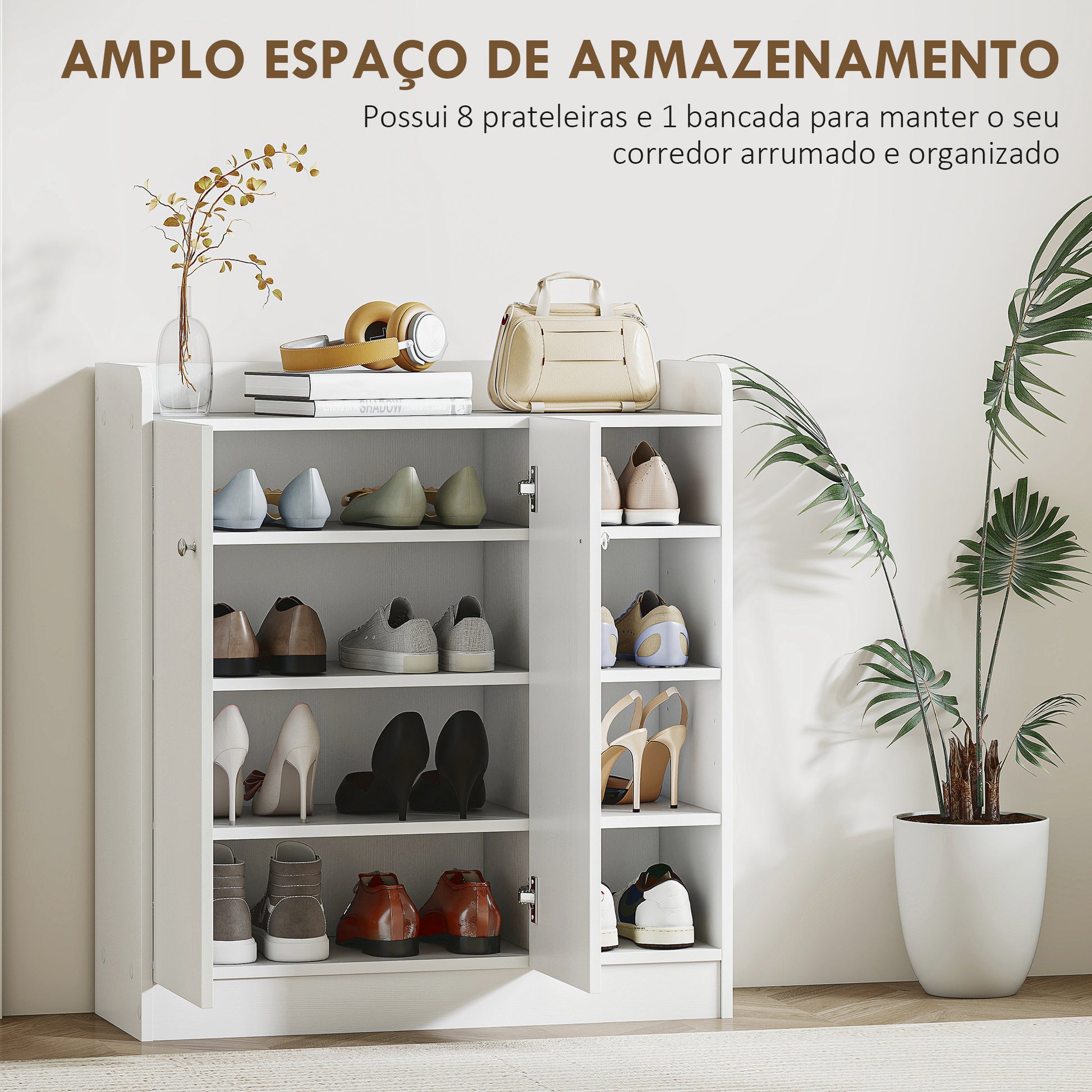 Este sapateira armário multiuso branco é a solução perfeita para manter a sua casa organizada. Com prateleiras interiores e exteriores, oferece um amplo espaço de armazenamento para até 12 pares de sapatos e pequenos objetos.
