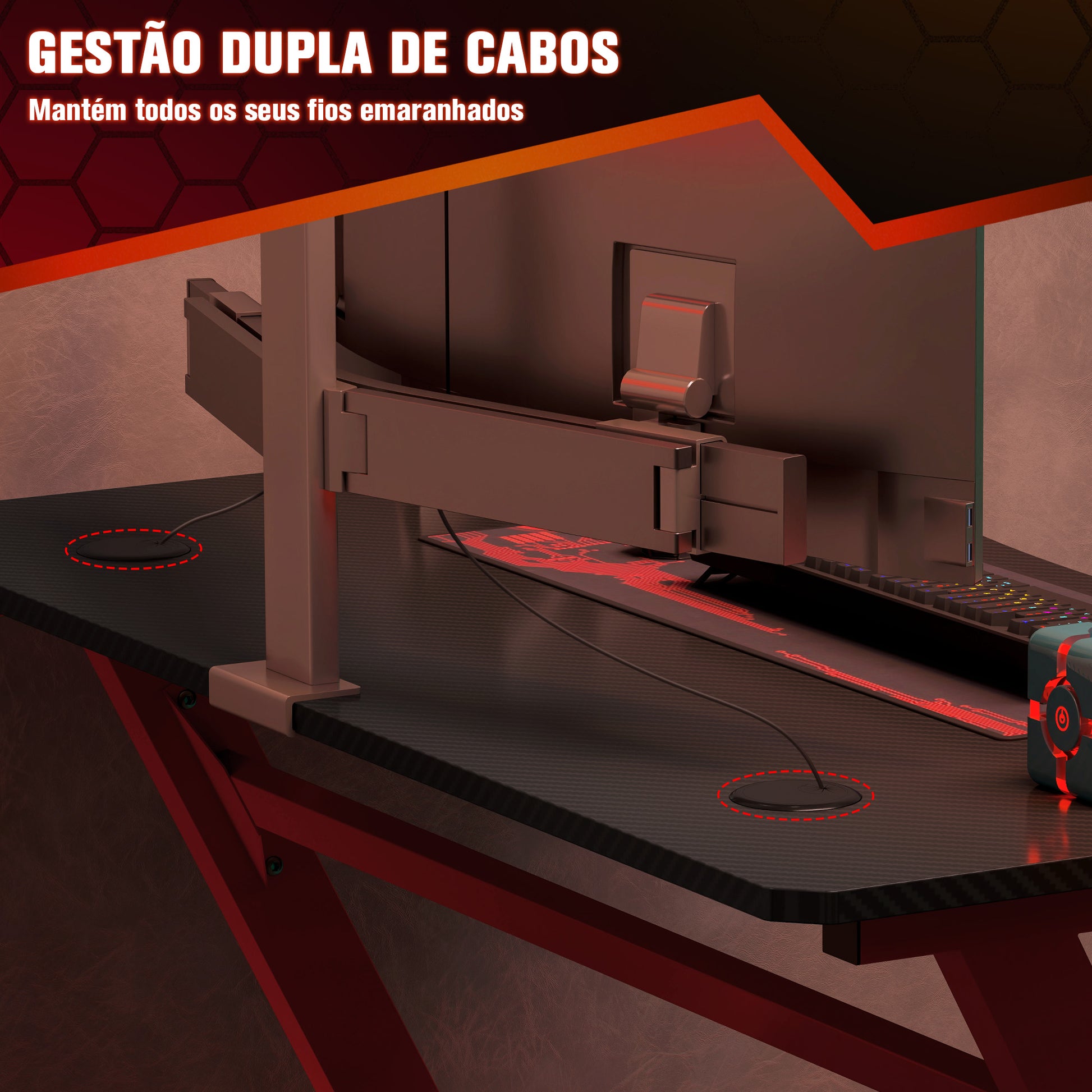 A secretária gaming em vermelho e preto da marca HOMCOM é o complemento perfeito para o seu setup de jogos, garantindo praticidade e estilo ao mesmo tempo.