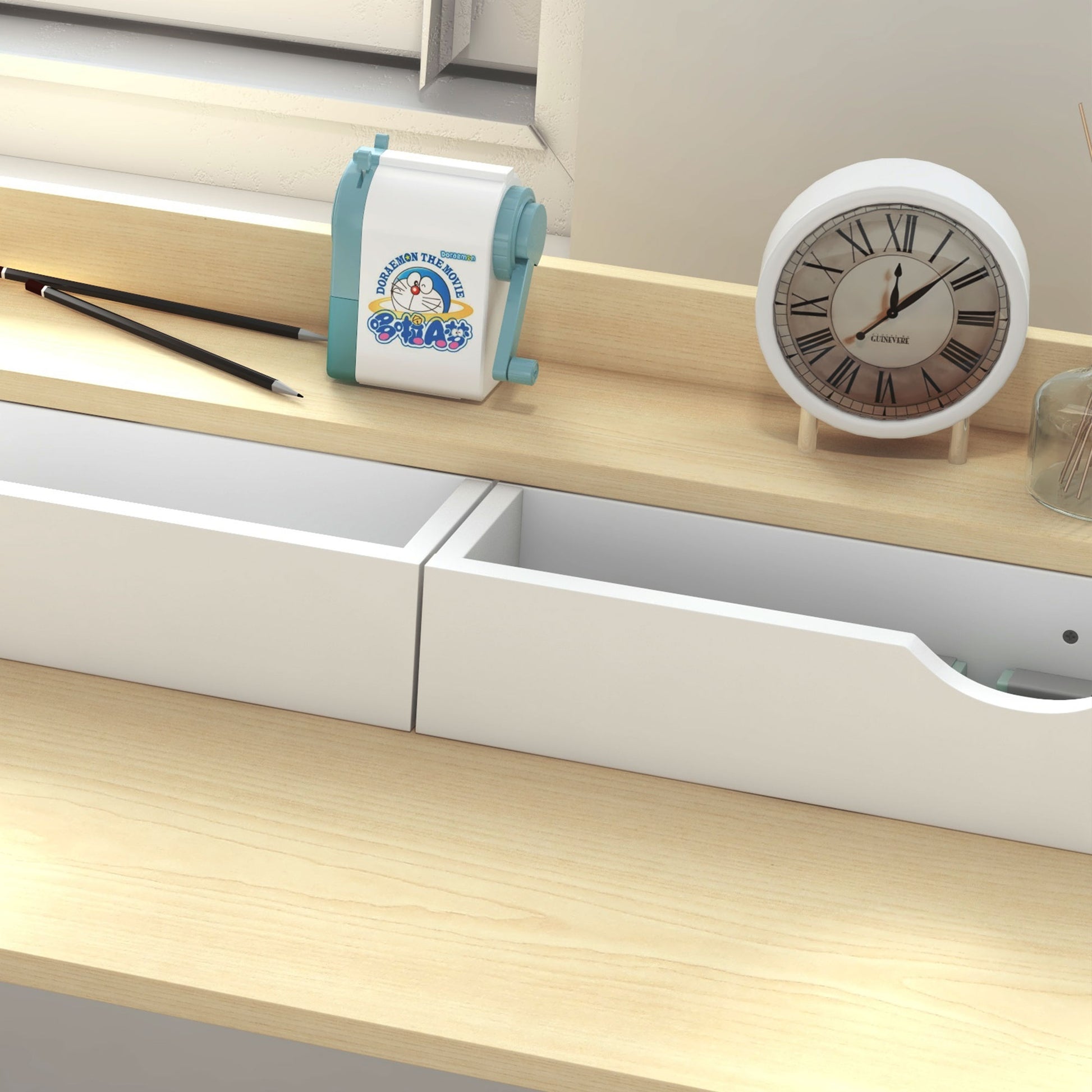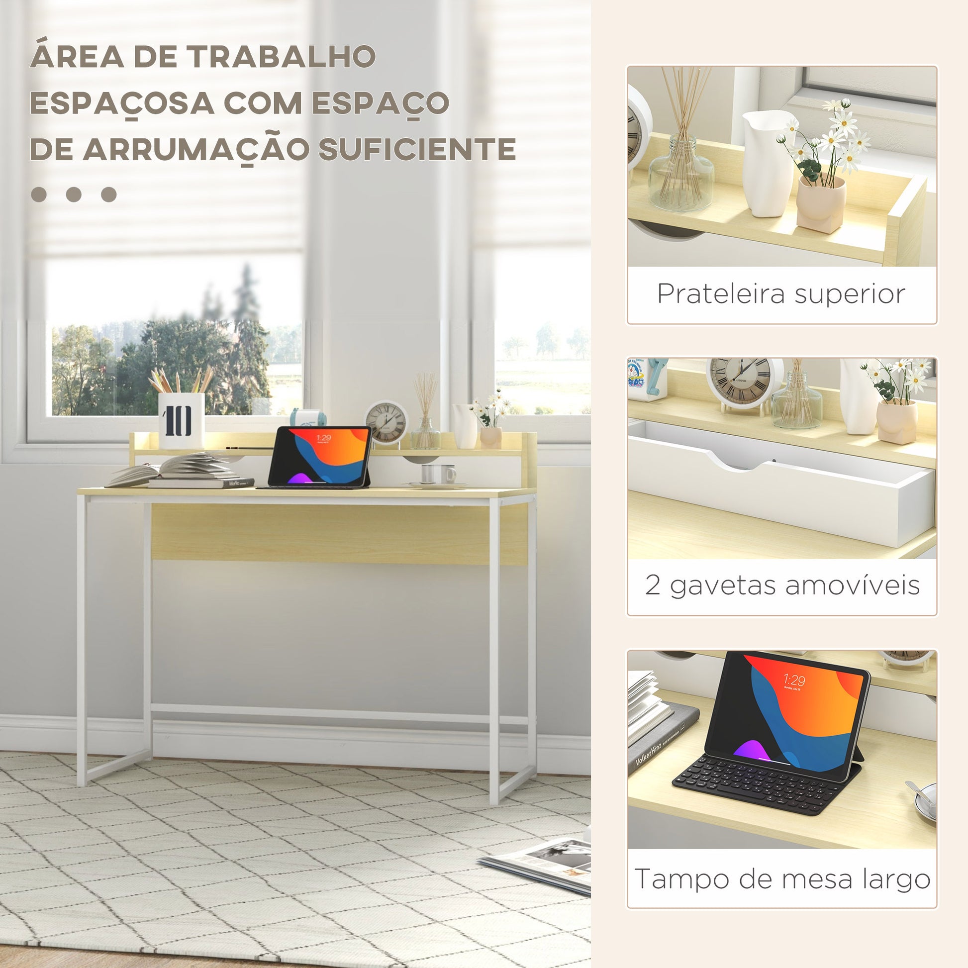 Esta secretária moderna é perfeita para manter o seu espaço de trabalho organizado e elegante. Com um estante na bancada e duas gavetas removíveis, oferece amplo espaço de armazenamento para os seus artigos de papelaria ou de escritório.