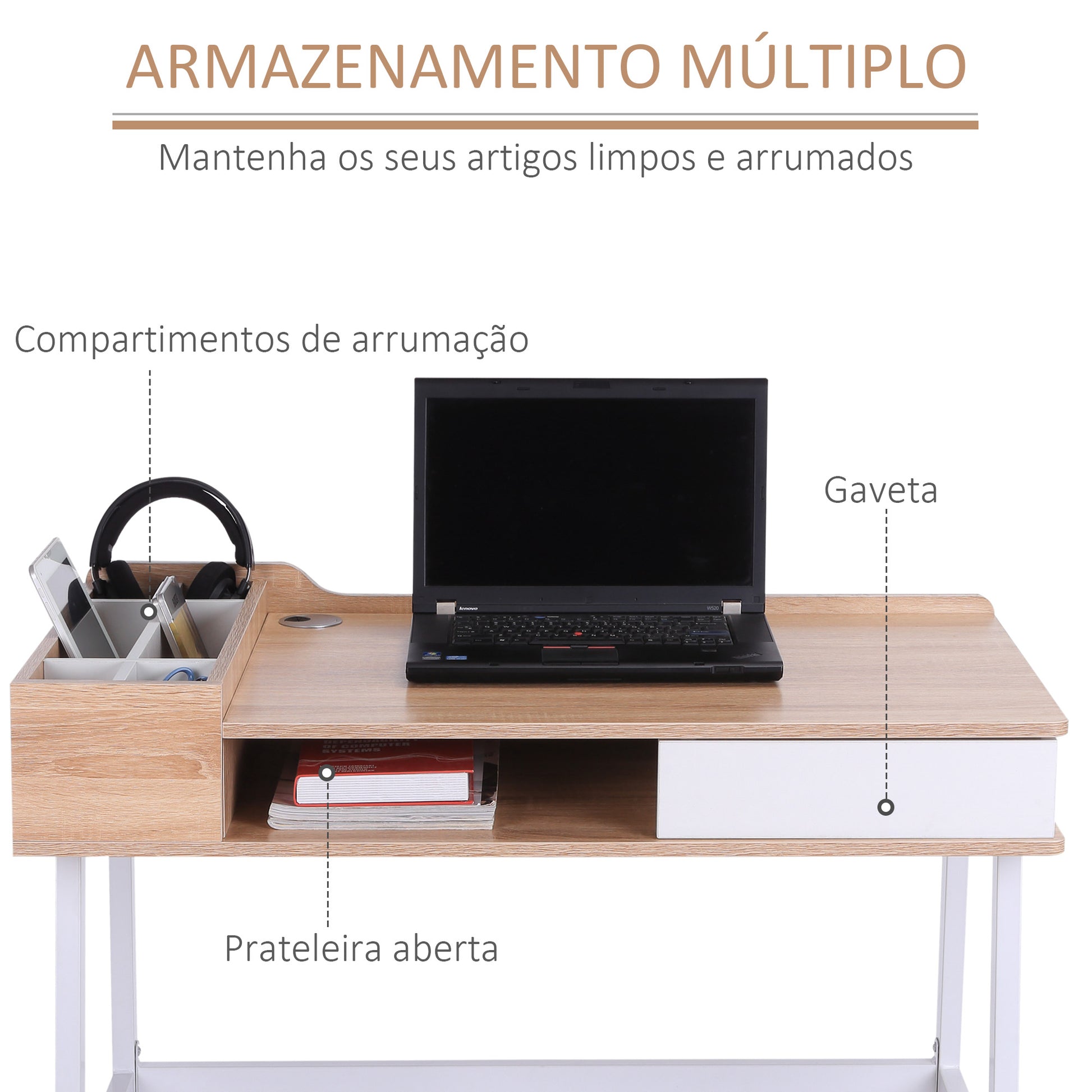 A secretária HOMCOM oferece muito espaço de arrumação com gaveta lateral aberta e 6 compartimentos, além de compartimento aberto e gaveta debaixo do tampo. Com acabamentos em carvalho e branco, é resistente e elegante para qualquer ambiente.