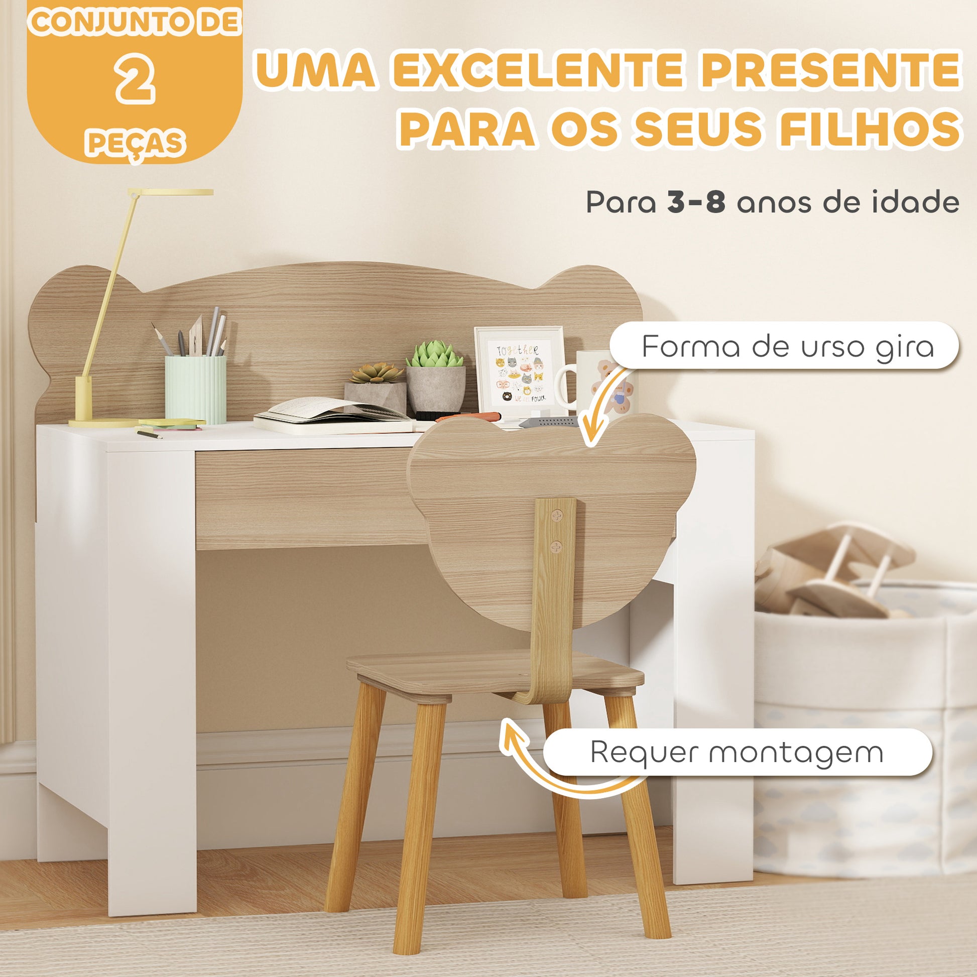 Secretária para Crianças com Cadeira em Forma de Ursinho - 80x41x74,5 cm - Madeira e Branco