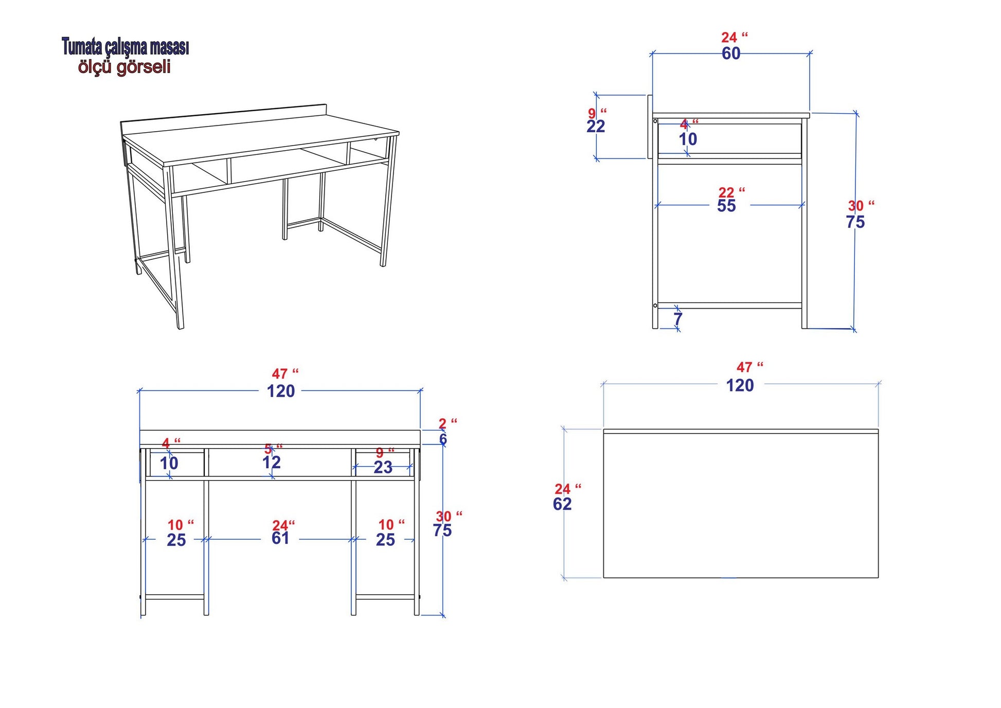 Com uma largura de 120 cm, uma altura de 75 cm e uma profundidade de 60 cm, a nossa secretária oferece um espaço amplo para todos os seus objectos de estudo essenciais. A prateleira por baixo da secretária, com uma altura de 12 cm, proporciona arrumação adicional para livros, artigos de papelaria e outros itens, mantendo o seu espaço de trabalho organizado e sem desordem.