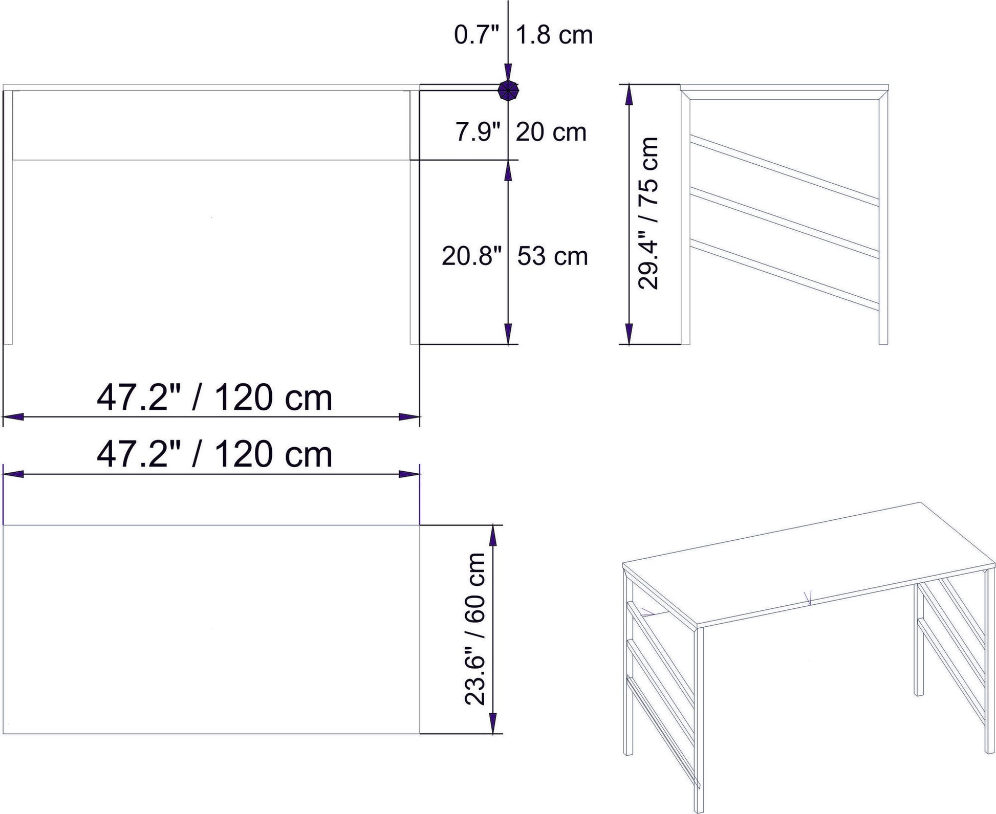 Com 120 cm de largura, 75 cm de altura e 60 cm de profundidade, a nossa secretária oferece um espaço amplo para todos os seus objectos de estudo essenciais. Quer precise de espaço para o seu computador portátil, livros ou artigos de papelaria, esta secretária tem tudo o que precisa.