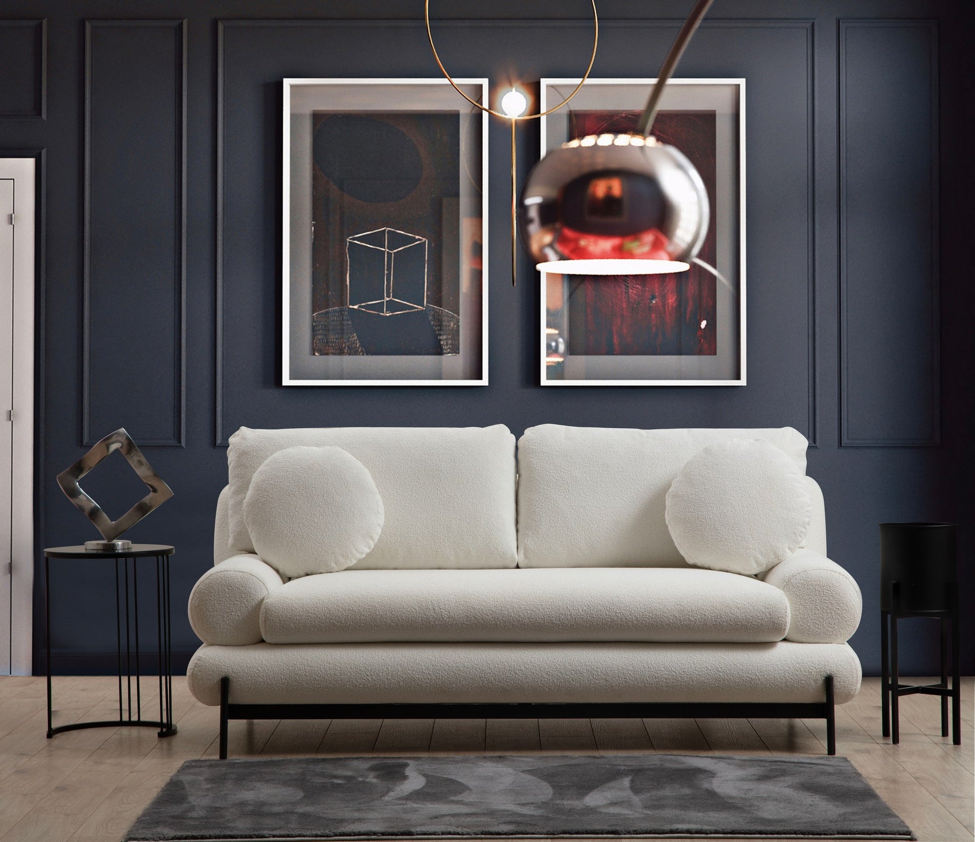 Sofá elegante de 2 lugares, branco, 188 x 85 x 92 cm | Estrutura em madeira de faia e aglomerado, tecido 100% poliéster | Encosto em espuma cinza macia e silicone, inclui 2 almofadas