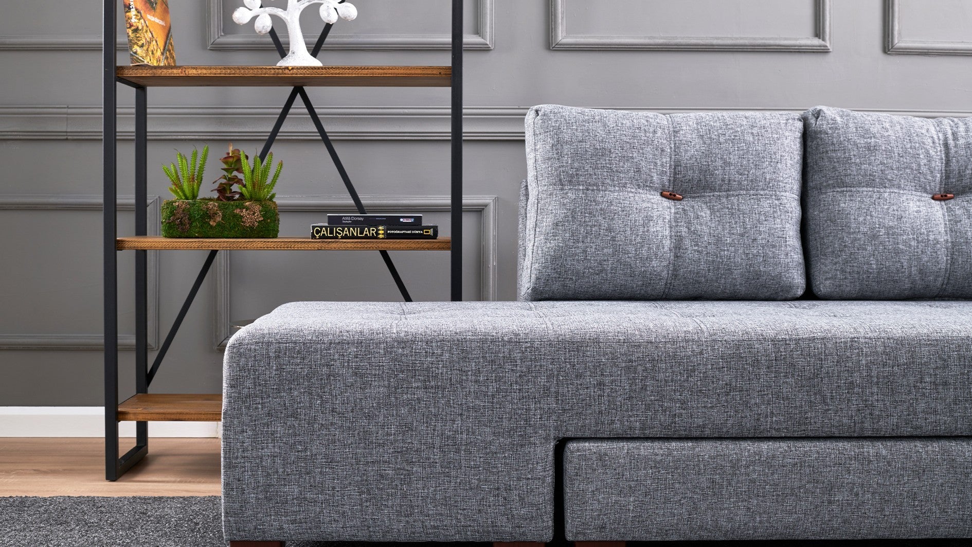 Com um design elegante e moderno, o nosso sofá-cama de canto elevará sem esforço o estilo da sua sala de estar. A cor cinzenta sólida acrescenta um toque de sofisticação, enquanto as linhas simples e a forma contemporânea fazem dele uma peça de destaque em qualquer espaço.