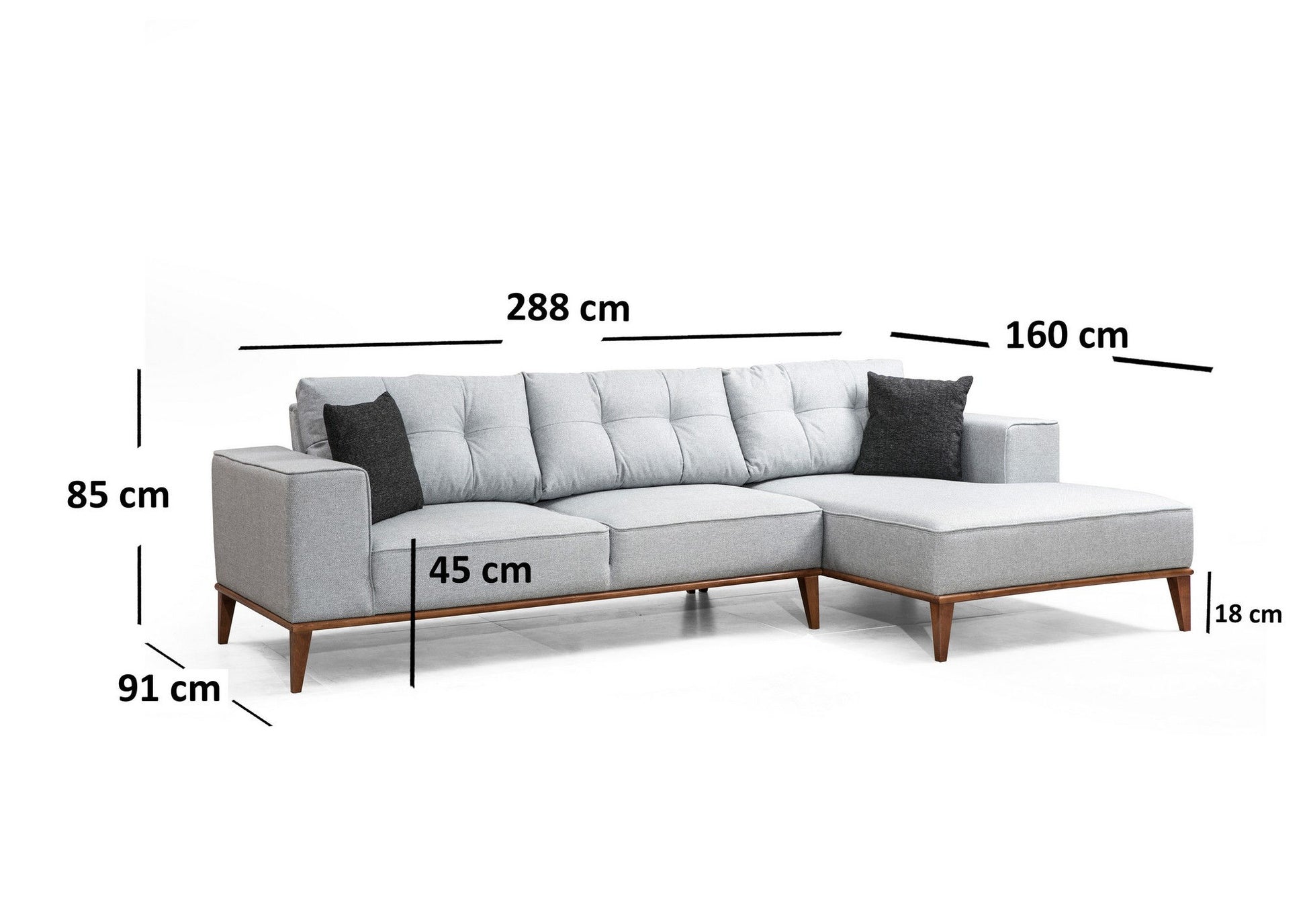 Sofá-cama de canto elegante, cinza claro, 288 x 160 cm | Estrutura em madeira de faia e aglomerado, 100% poliéster, pernas em nogueira | Confortável e versátil para espaços modernos