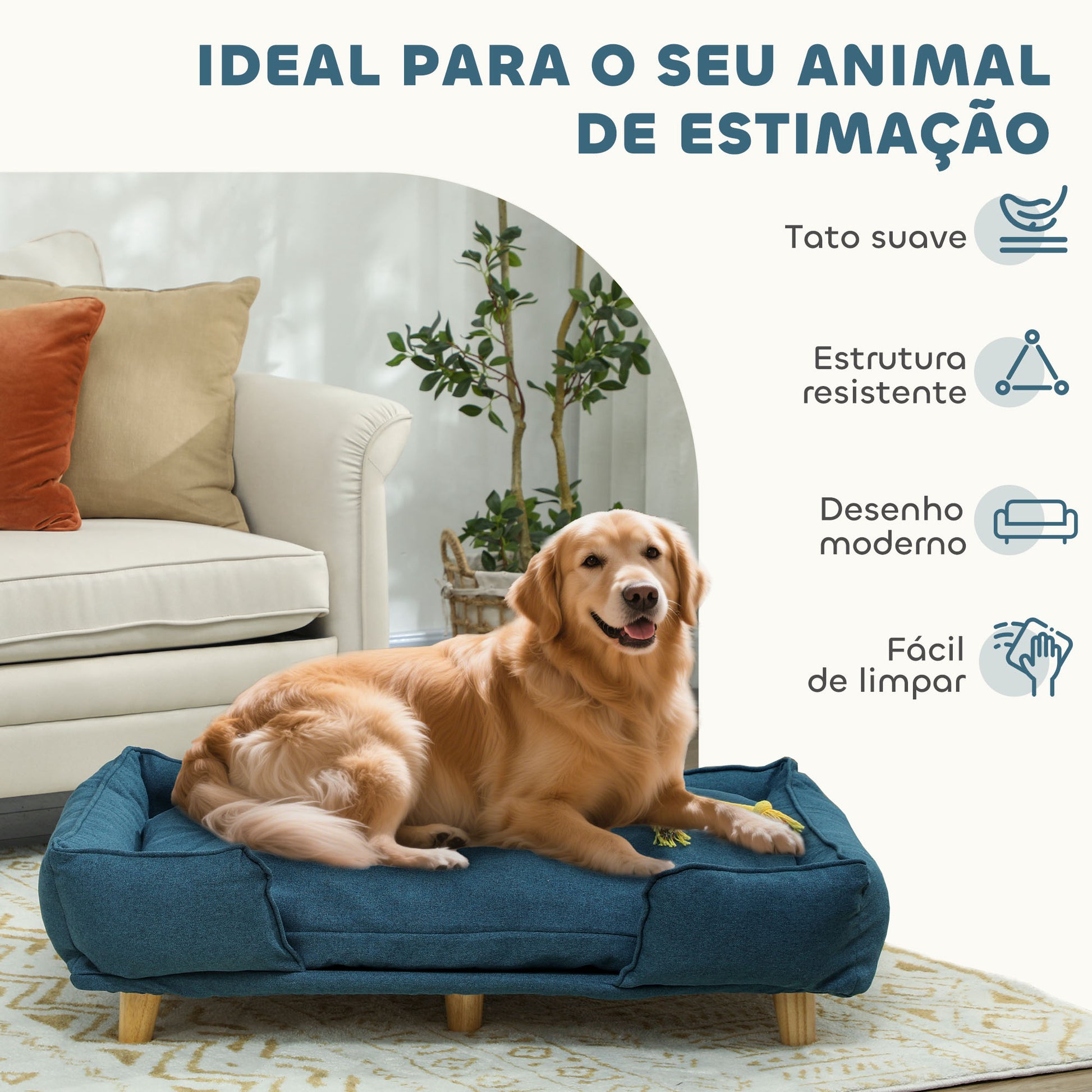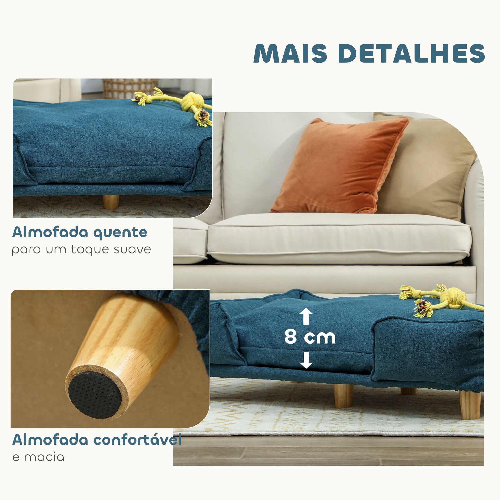 - Benefícios: Almofada removível para facilitar a limpeza e manutenção; Estrutura resistente e estável; Pés antiderrapantes para proteger os pisos; Acolchoado em algodão para um espaço de descanso aconchegante