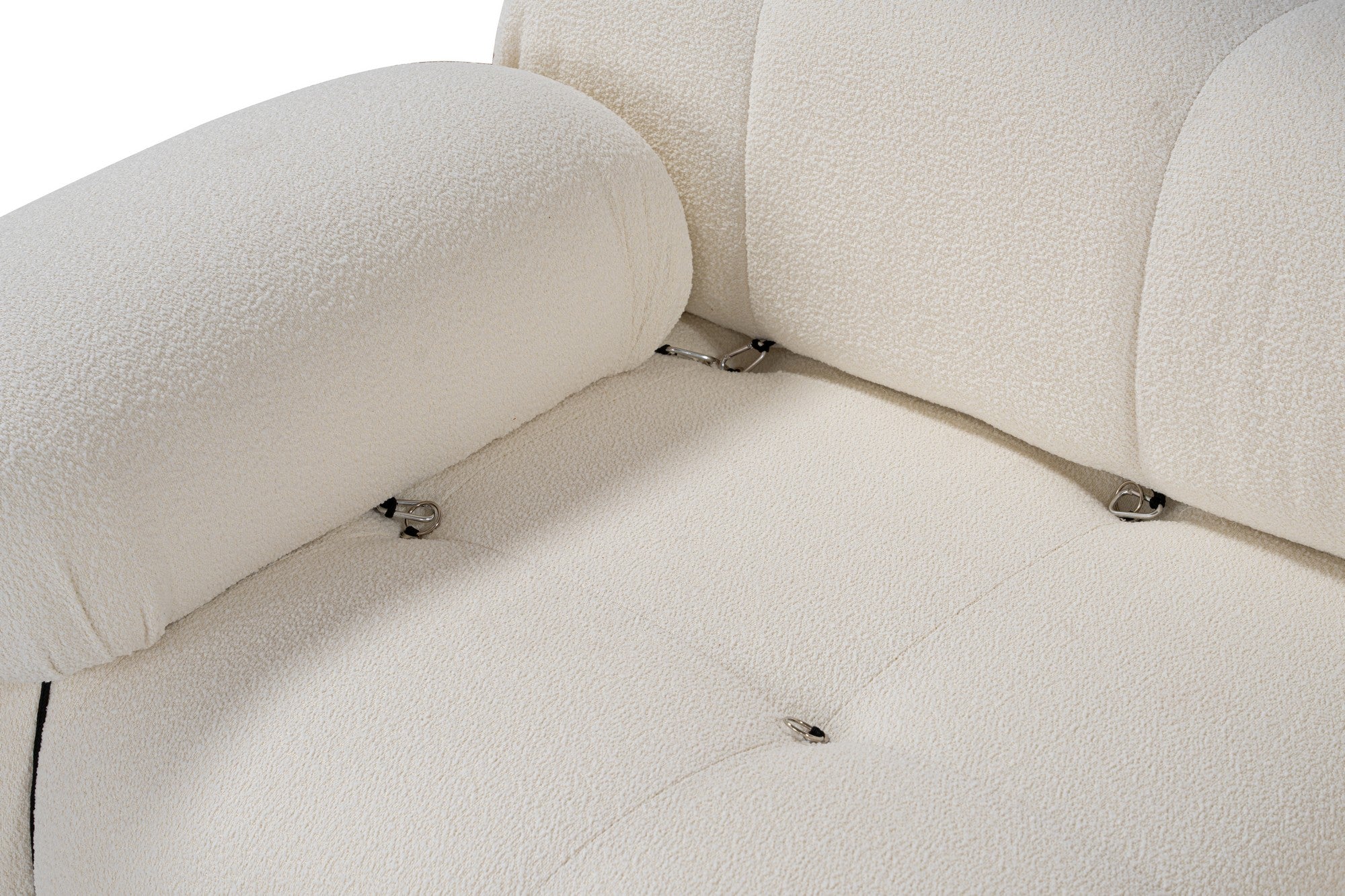 O sistema de sofá pode ser facilmente personalizado com outras unidades modulares para se adequar ao seu espaço e preferências de estilo. O tecido lavável a seco garante fácil manutenção e beleza duradoura. As pernas de plástico preto fosco adicionam um toque moderno à clássica cor creme, tornando-o uma peça versátil que complementa qualquer decoração.