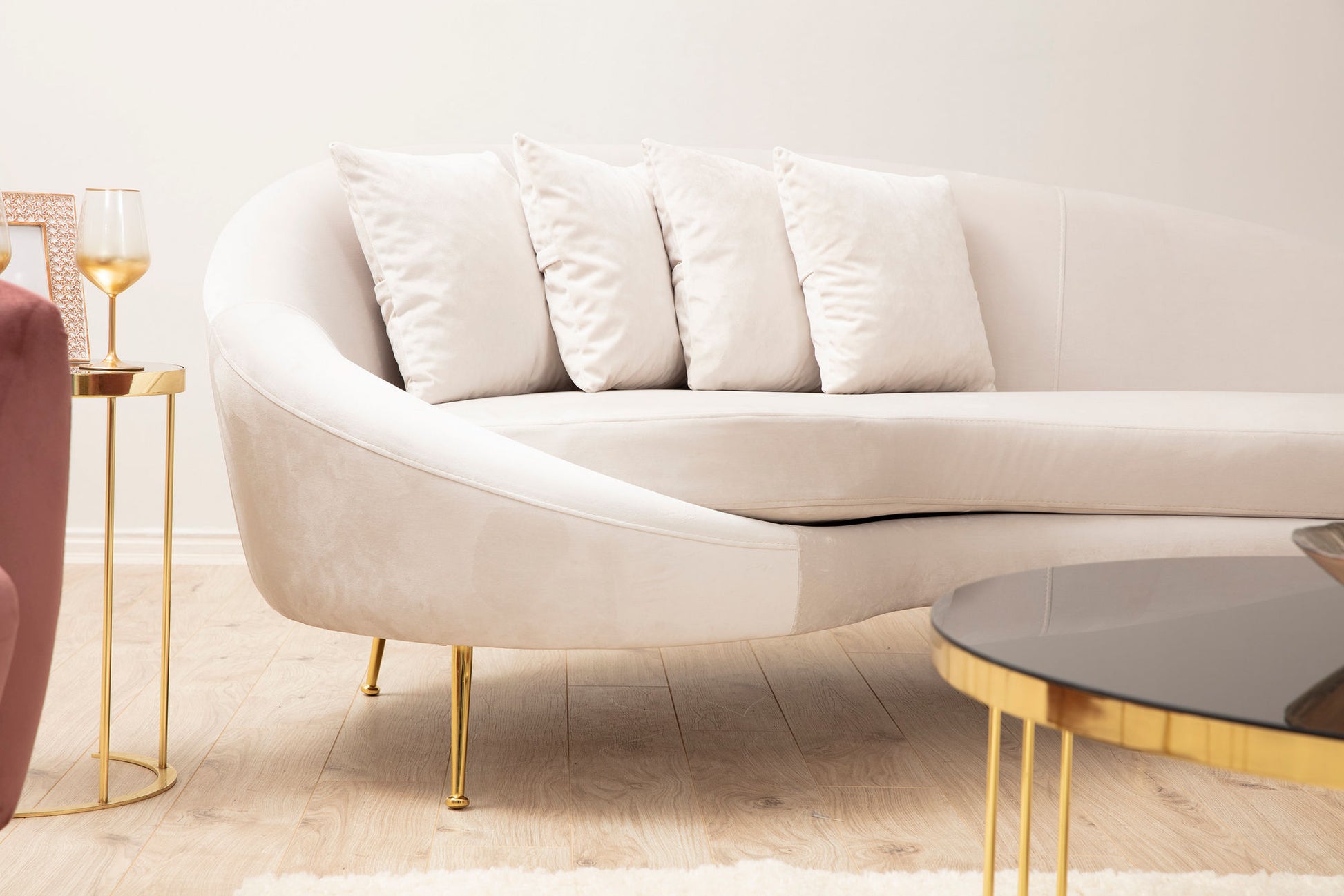 - Pernas: Pernas de metal dourado
