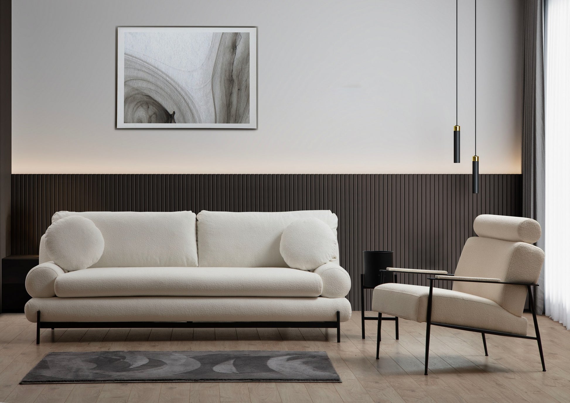 Fabricado com uma estrutura robusta em madeira de faia e aglomerado de madeira, este sofá exala durabilidade e longevidade. O design elegante e moderno, juntamente com as pernas em metal preto mate, dá um toque de sofisticação a qualquer divisão. O tecido 100% poliéster numa bonita cor branca realça o apelo estético geral.