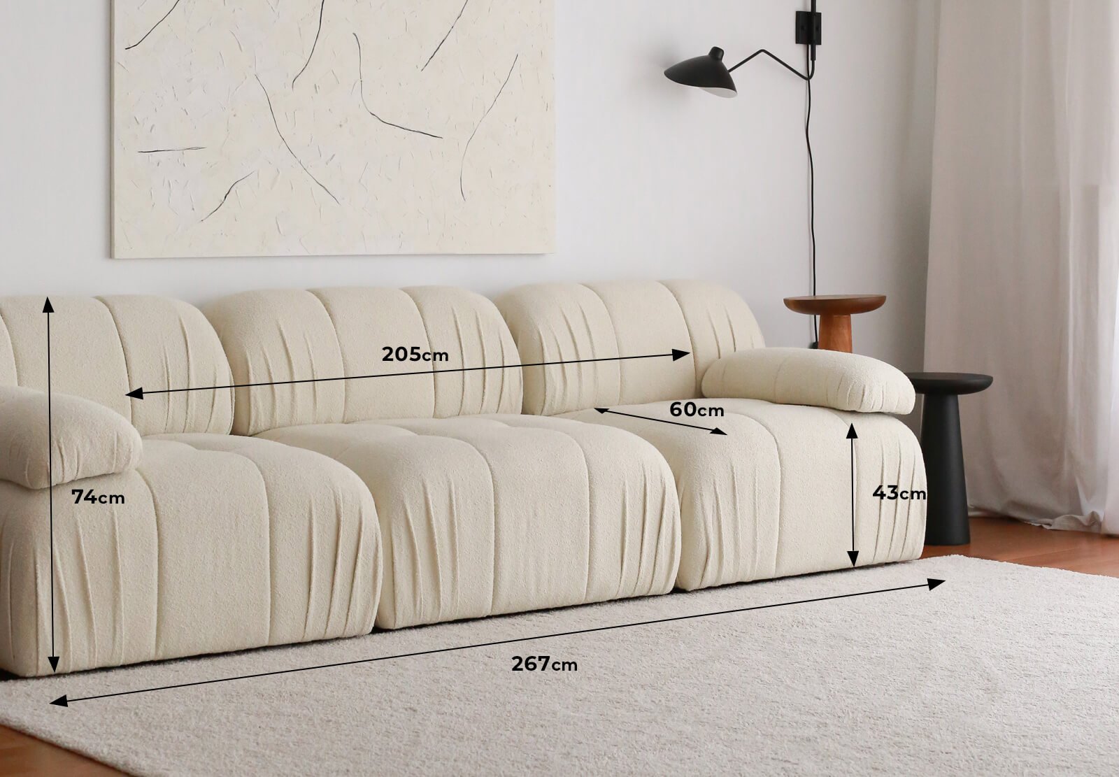 Sofá elegante de 3 lugares, branco, 267 cm | Estrutura 100% madeira de carpa, tecido 100% pelúcia | Design confortável com pernas de plástico, perfeito para espaços modernos
