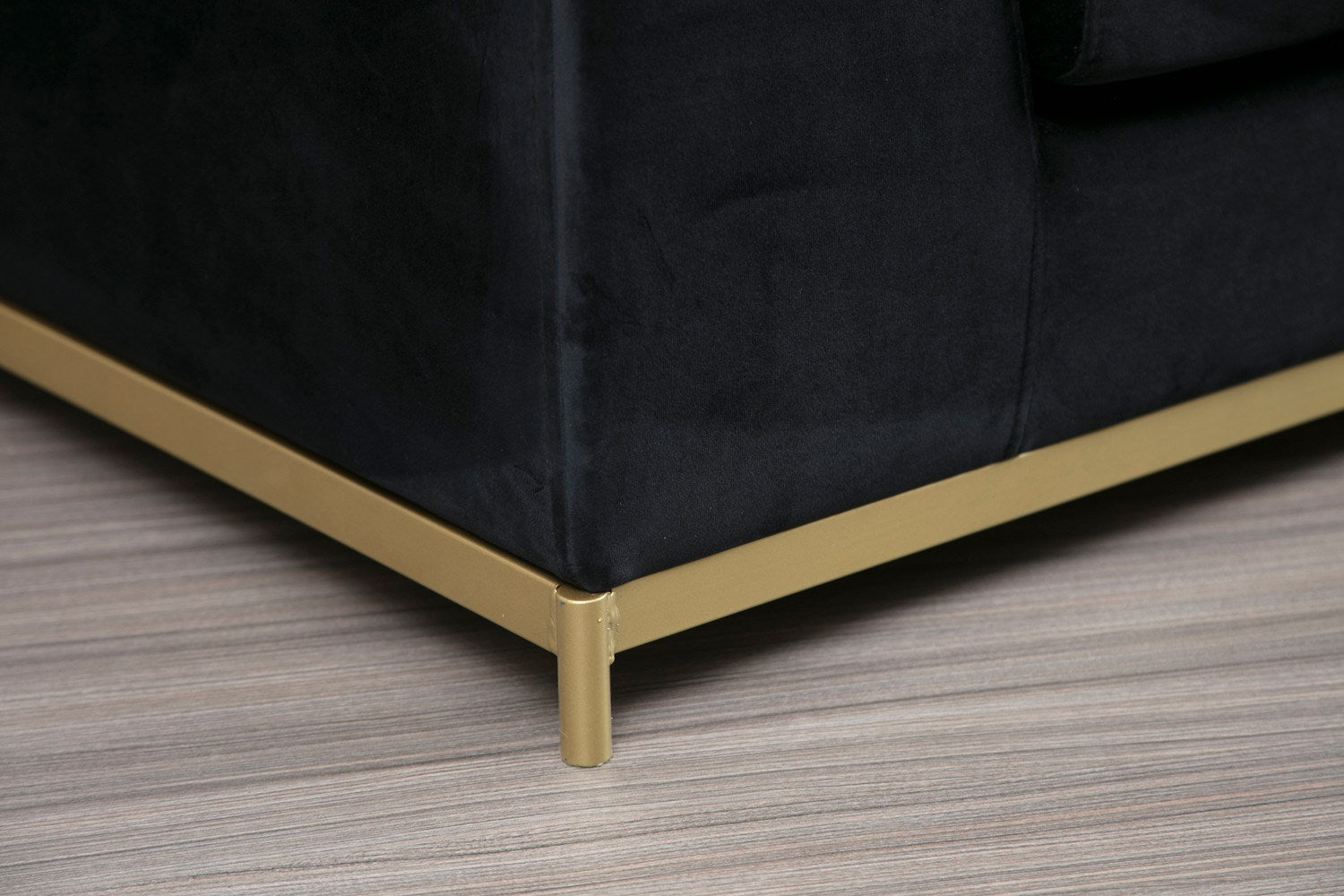 A silhueta elegante do sofá, combinada com as pernas de metal pintadas de dourado, exala uma sensação de glamour moderno que elevará instantaneamente a decoração da sua casa. A cor preta sólida adiciona um toque de sofisticação, tornando-o uma adição perfeita a qualquer ambiente inspirado em hotéis.