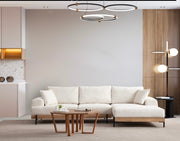 O design elegante e moderno do nosso sofá de canto complementará sem esforço qualquer estilo de decoração. As suas linhas simples e a cor branca neutra fazem dele uma peça versátil que pode ser facilmente incorporada em qualquer espaço. As pernas metálicas pretas dão-lhe um toque de sofisticação e estabilidade.