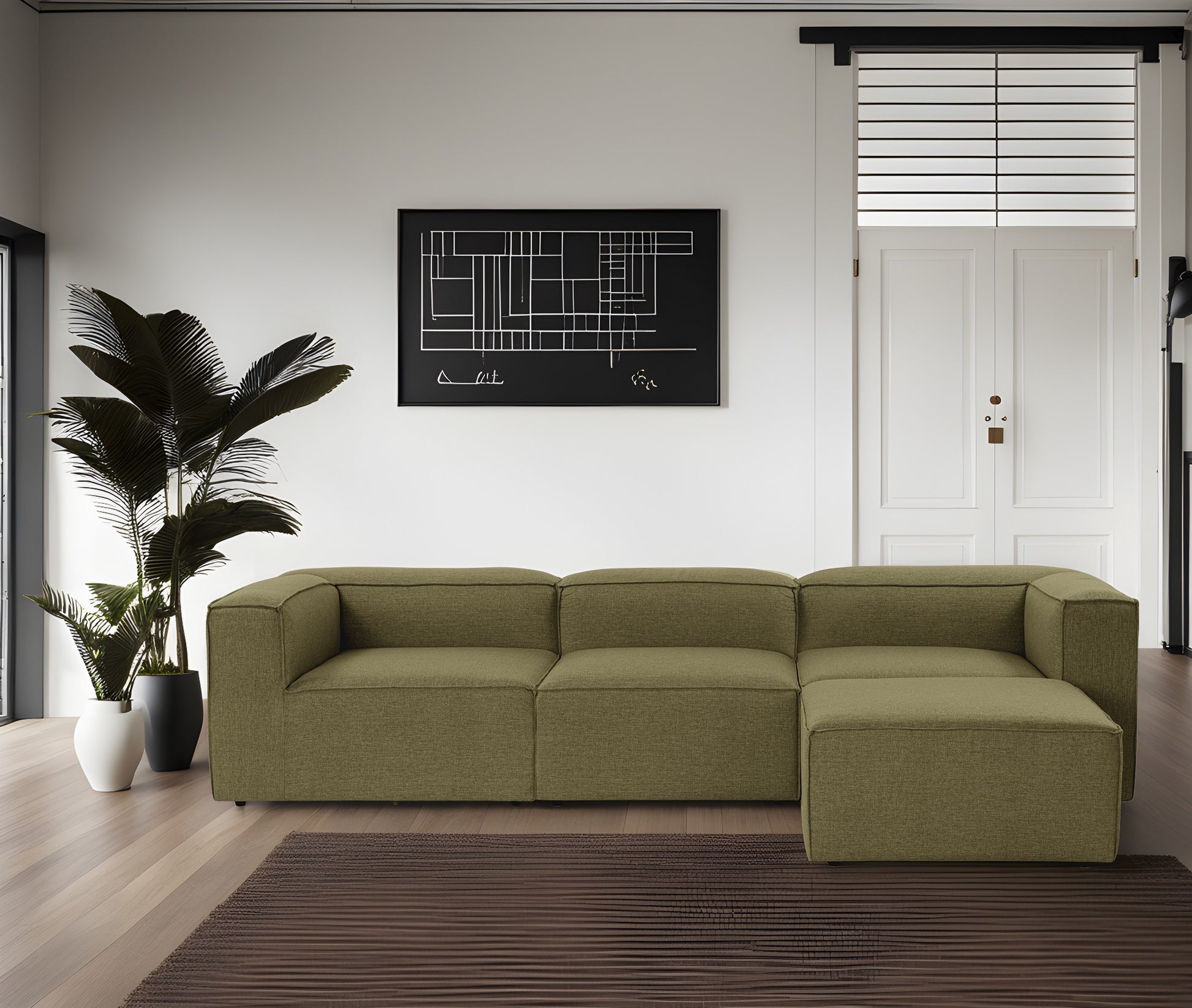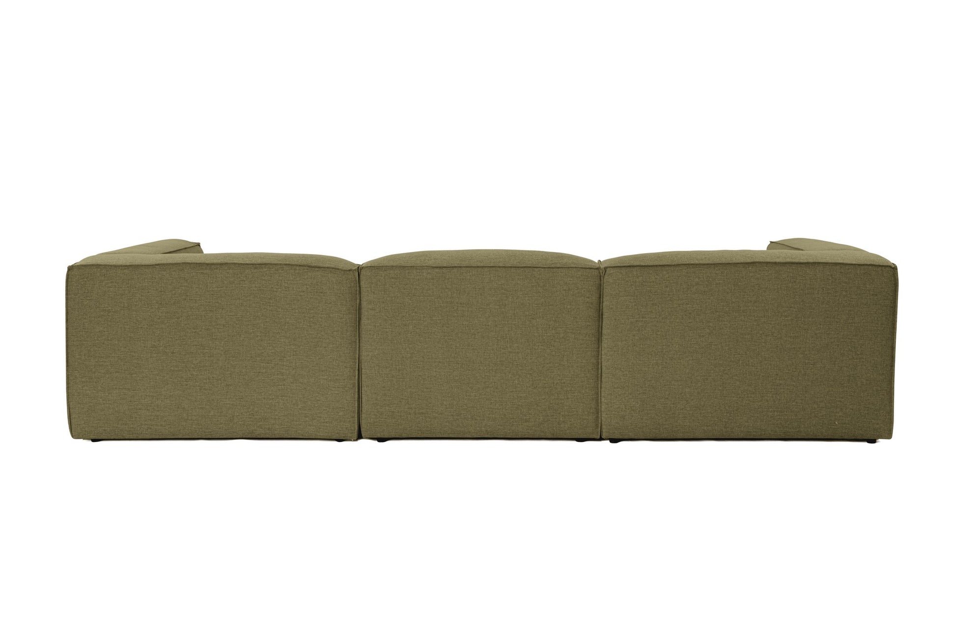 Sofá de canto elegante, verde, 296 cm de largura, tecido 100% linho, assentos de espuma DNS 32, estrutura de madeira de carpa, perfeito para salas de estar modernas e relaxamento