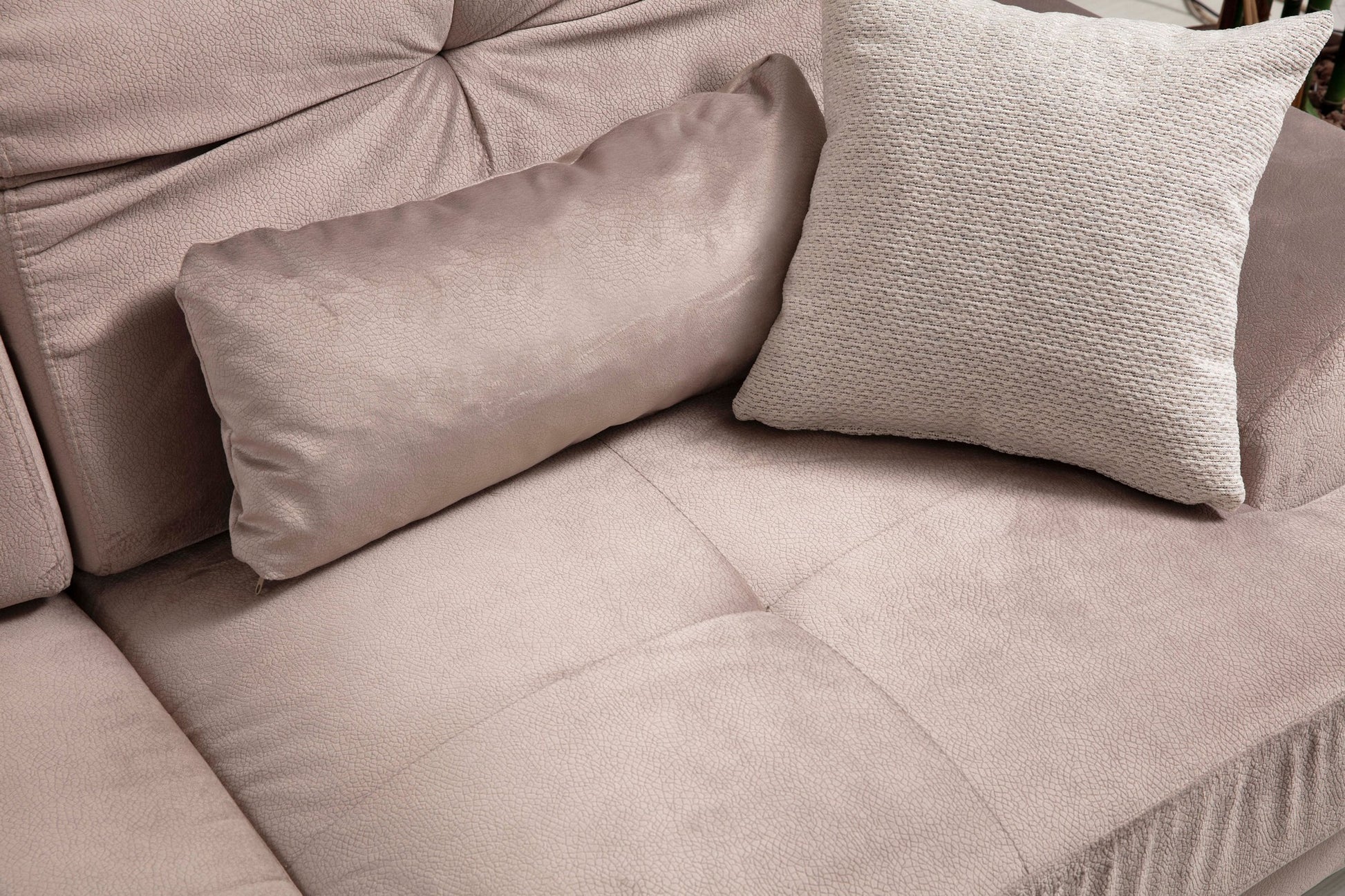 Sofá de canto bege com encosto ajustável, estrutura de madeira de faia, 190 x 308 cm | 100% poliéster, 5 almofadas incluídas, design industrial moderno, fácil de cuidar