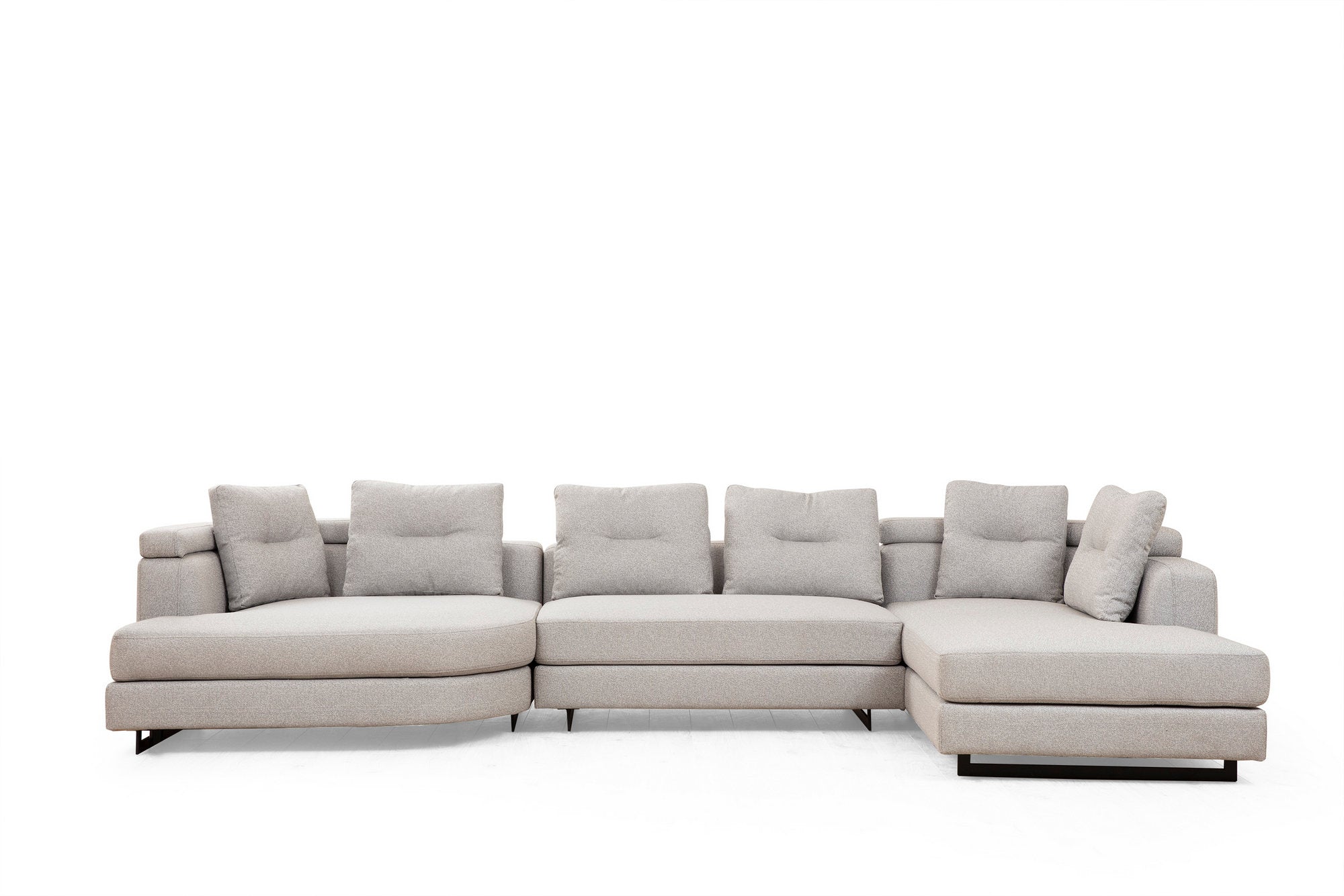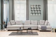 Sofá de canto elegante, cinza claro, 140 x 385 x 200 cm | Estrutura em madeira de faia e aglomerado, 100% poliéster, pernas de metal preto | Inclui 2 almofadas, perfeito para ambientes modernos