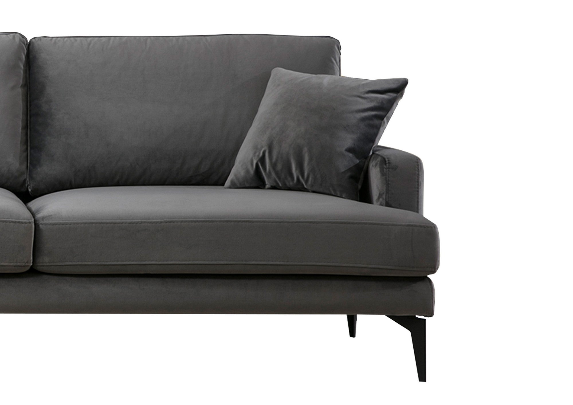 O design elegante deste sofá é complementado por pernas de metal preto fosco, adicionando um toque de charme industrial ao seu espaço. A paleta de cores cinza sólido se encaixa perfeitamente em qualquer decoração, tornando-o uma adição versátil à sua casa.