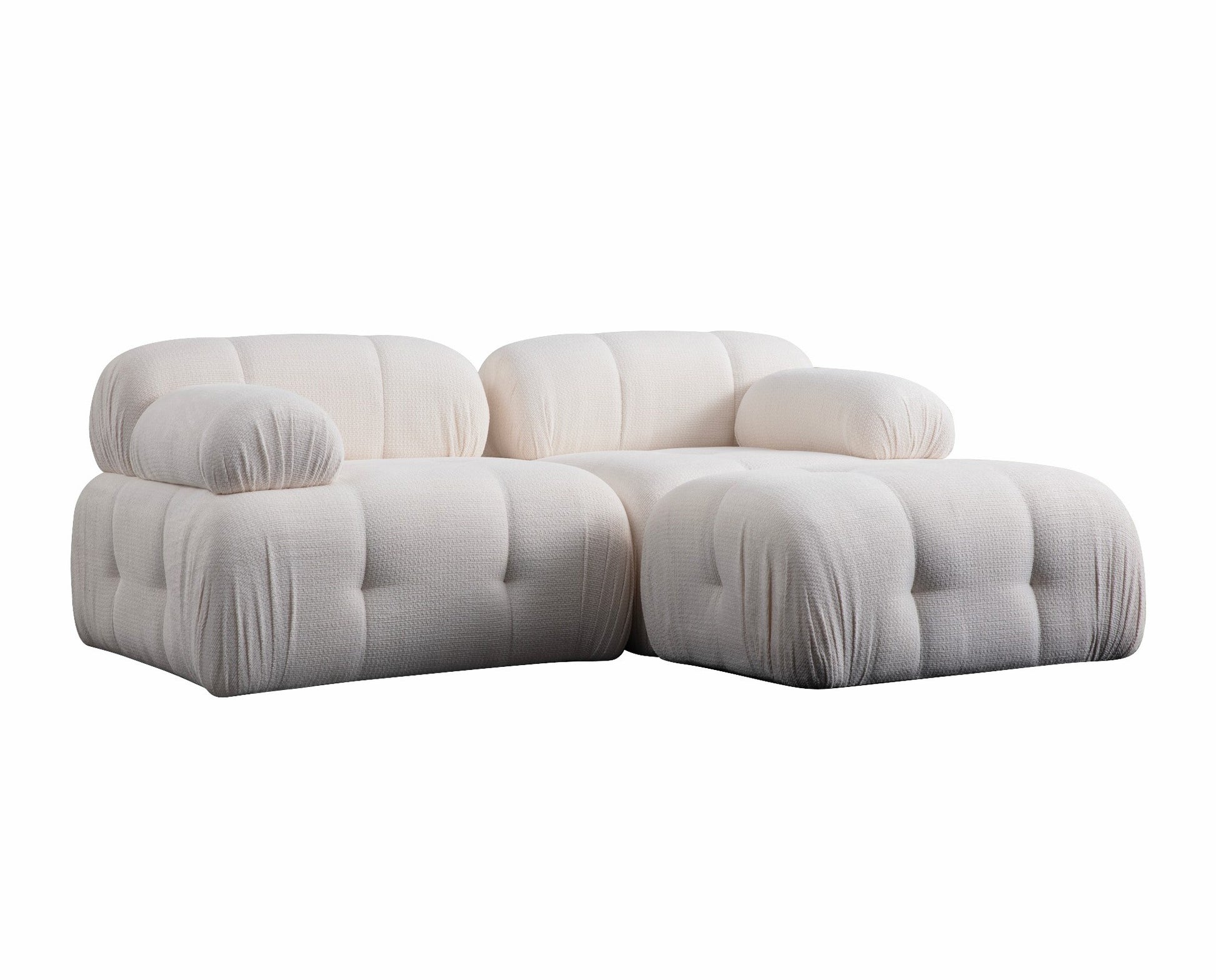 O design elegante deste sofá de canto é complementado pelas pernas de plástico preto que dão um toque moderno ao aspeto geral. A cor branca do sofá dá um toque de sofisticação a qualquer divisão, tornando-o numa peça versátil que se integra facilmente em qualquer estilo de decoração.