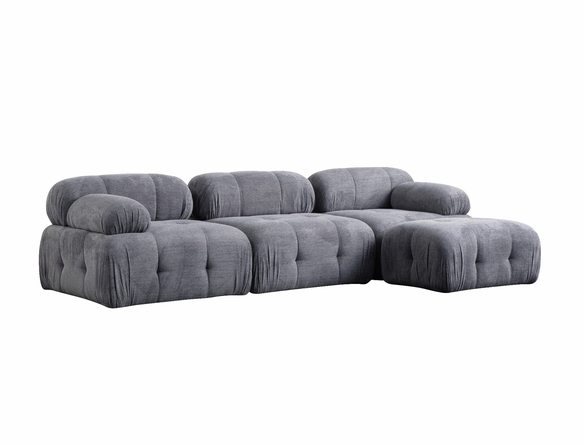 Com um comprimento de 290 x 160 cm e uma largura de 95 cm, este sofá proporciona um amplo espaço para se sentar a si e aos seus entes queridos. A espuma cinzenta macia de 28 dns e o enchimento de penas de 24 dns asseguram o máximo conforto, enquanto a espuma 60% cortada e 40% de espuma de silicone nas costas oferecem um excelente apoio. As elegantes pernas de plástico preto dão um toque moderno ao design, tornando-a numa adição elegante a qualquer casa.
