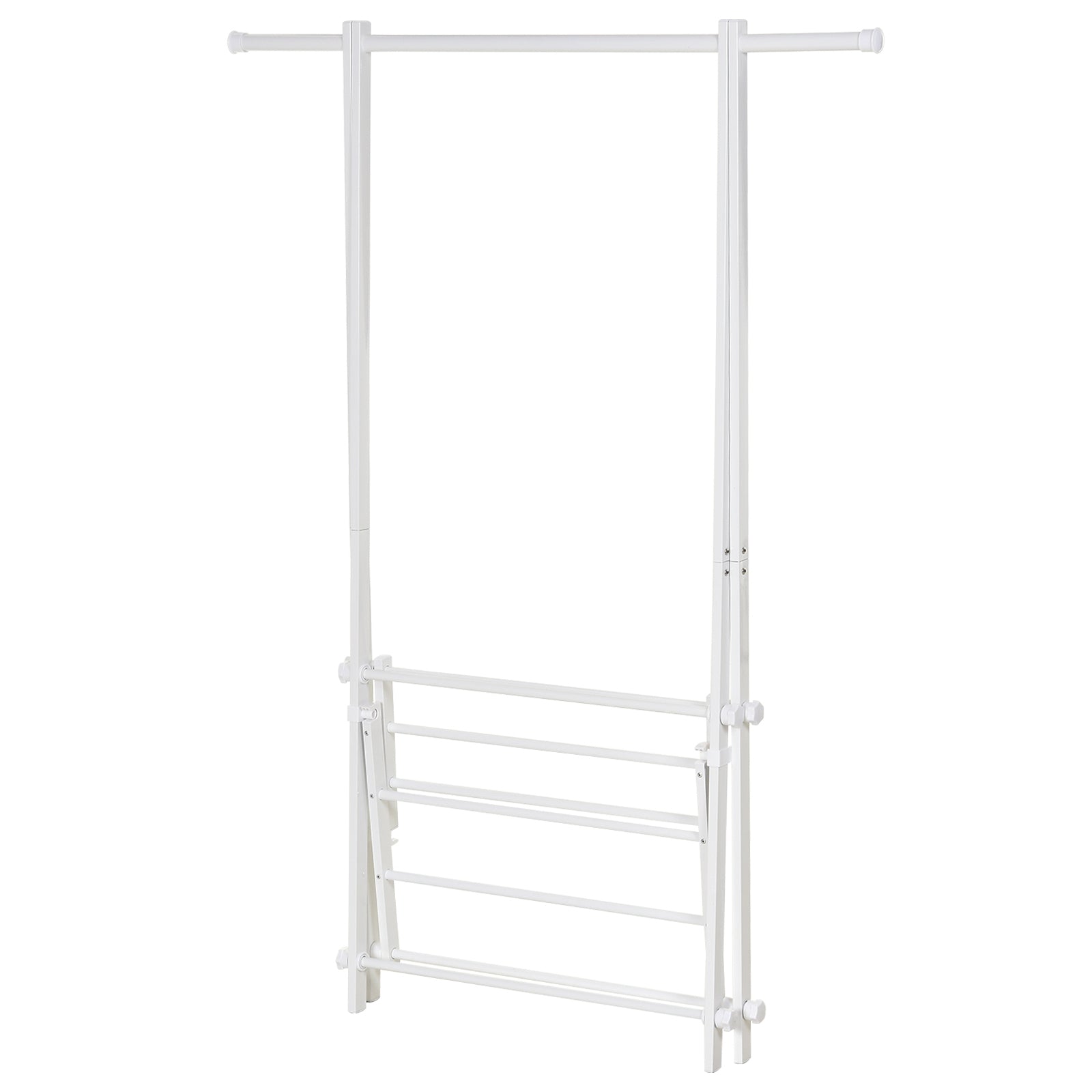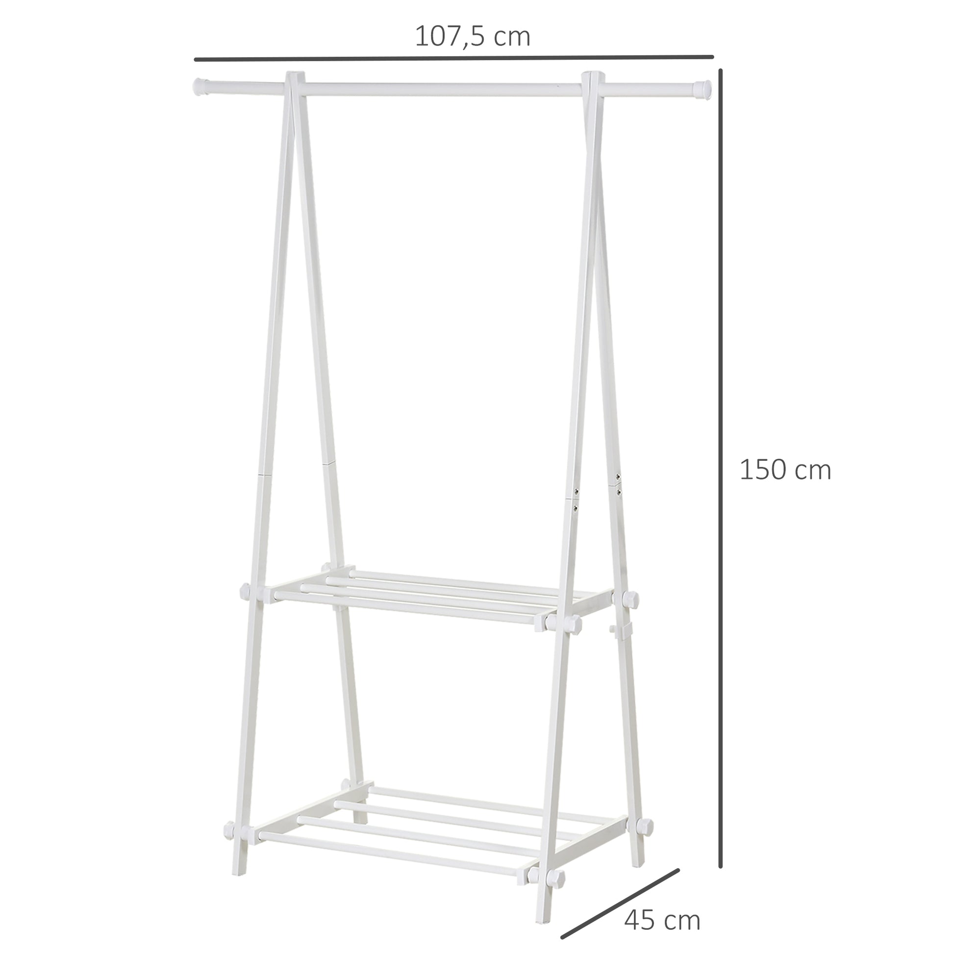 Organize suas roupas de forma prática e elegante com este suporte para cabide dobrável em branco. Com medidas de 107,5x45x150 cm, este suporte oferece duas prateleiras para armazenar sapatos, bolsas e caixas, além de uma barra para pendurar roupas.