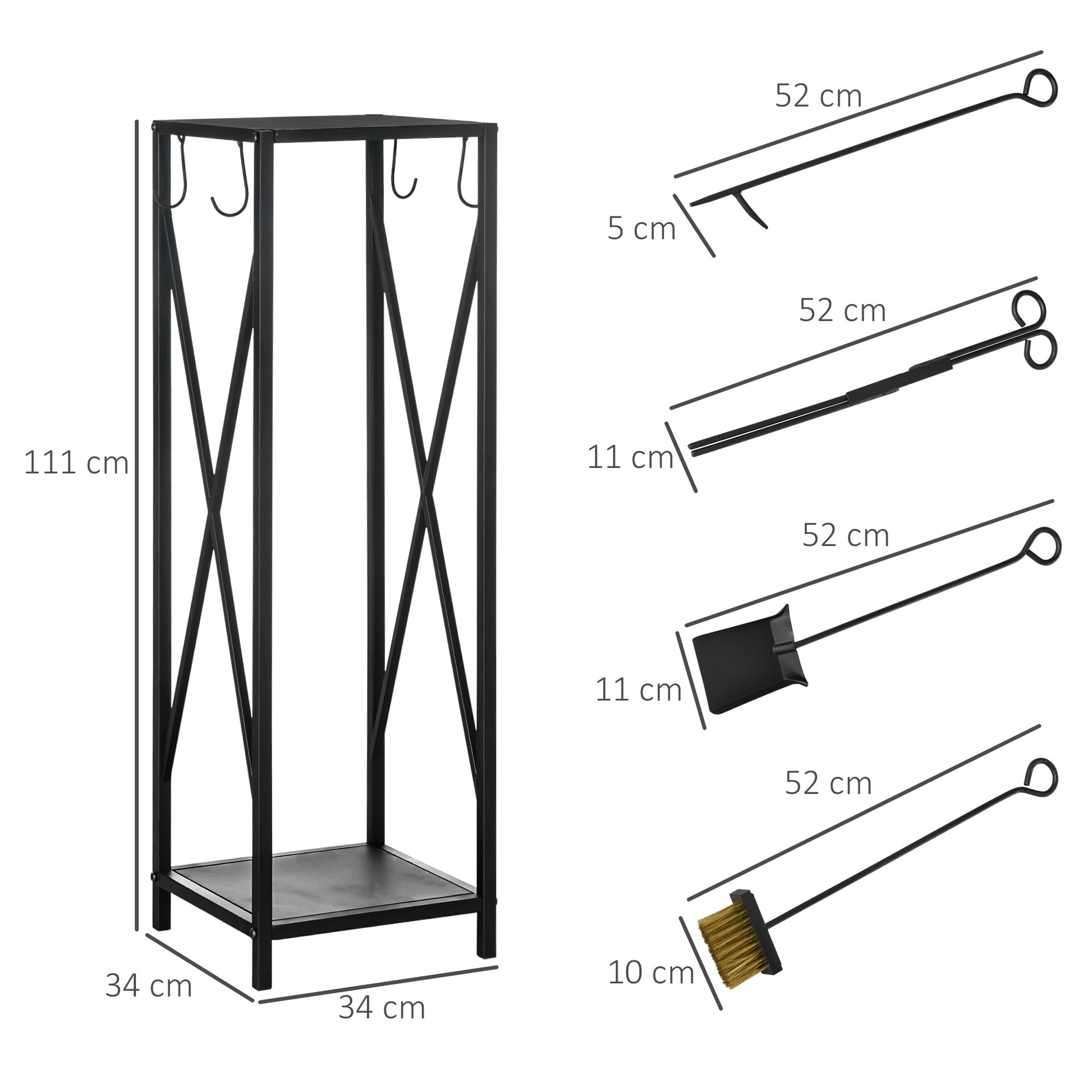 - Outras especificações: Inclui pá, escova, atiçador, tenazes e 4 ganchos para pendurar acessórios