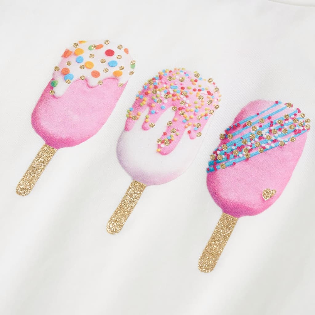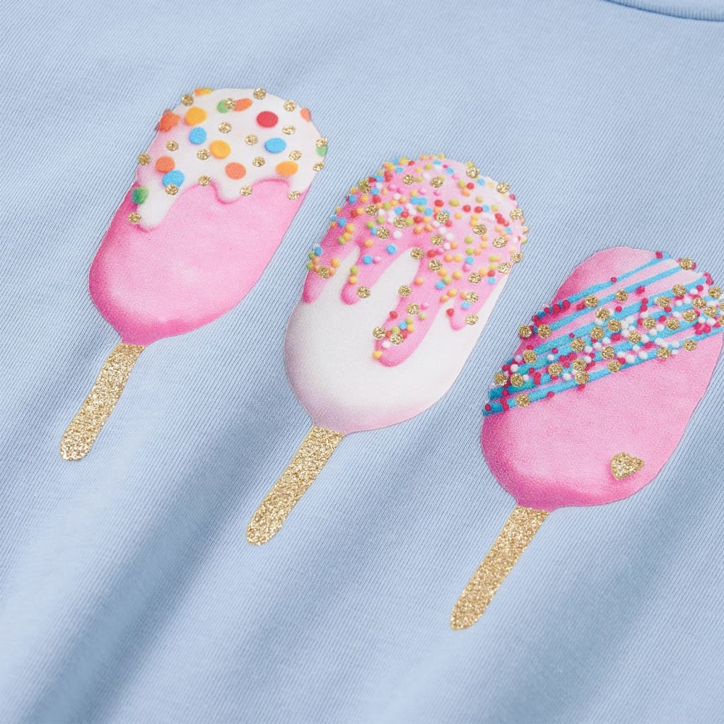Esta t-shirt para criança possui mangas curtas, uma gola redonda e um corte a direito. Esta t-shirt infantil apresenta uma estampa de gelados e é feita de 95% algodão, proporcionando um toque macio e confortável.