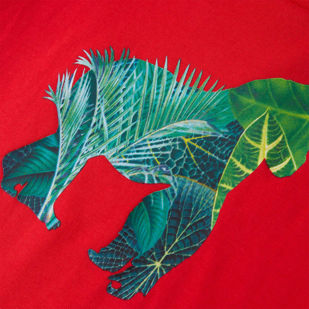 Esta t-shirt para criança possui mangas curtas, uma gola redonda e um modelo de corte a direito. Esta t-shirt apresenta uma estampa de folhas que forma a silhueta de um gorila. A t-shirt de manga curta para criança é fabricada em 100% algodão penteado tratado com silicone e enzimas para um toque suave e confortável.