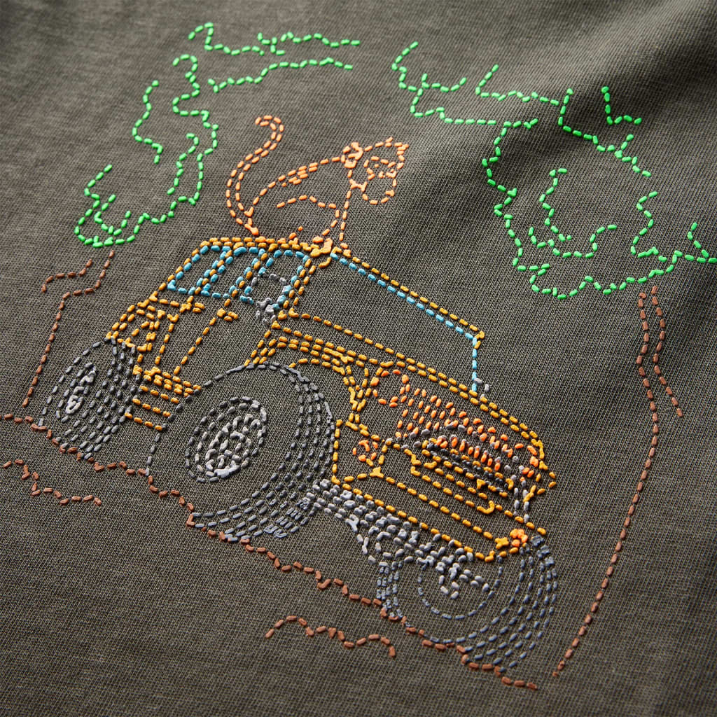 Esta t-shirt para criança possui mangas compridas, uma gola redonda e um modelo de corte reto. Esta t-shirt cor caqui apresenta um jipe e um macaco na floresta. A t-shirt infantil de manga comprida é feita de 100% algodão tratado com silicone e enzimas para um toque suave e confortável.