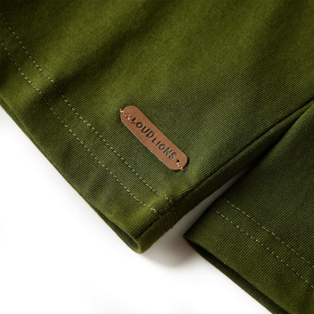Esta t-shirt para criança possui mangas compridas, uma gola redonda e um modelo de corte reto. Esta t-shirt caqui-escura apresenta as palavras Little Monkey e uns macaquinhos adoráveis. A t-shirt de manga comprida para criança é feita de 100% algodão tratado com silicone e enzimas para um toque suave e confortável.