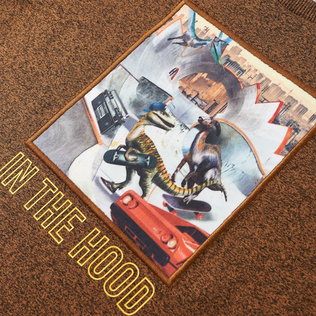 Esta t-shirt para criança possui mangas compridas, uma gola redonda e um modelo de corte reto. Esta t-shirt cor conhaque mesclado apresenta dinossauros na cidade. A t-shirt de manga comprida para criança é feita de 50% algodão e 50% poliéster tratados com silicone e enzimas para um toque suave e confortável.