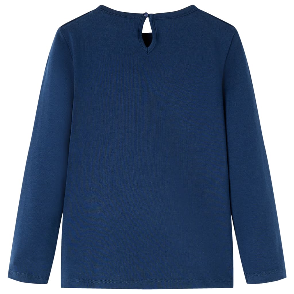 Esta t-shirt para criança possui mangas compridas, um decote redondo e uma abertura com um botão na parte de trás do pescoço. Esta t-shirt azul-marinho apresenta um cavalo adorável. A t-shirt infantil de manga comprida é feita de um material macio composto por 95% de algodão e 5% de elastano, proporcionando conforto e respirabilidade adicionais.