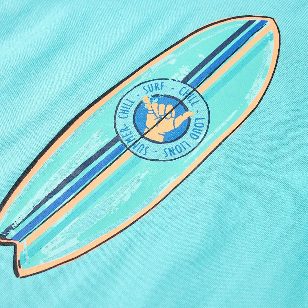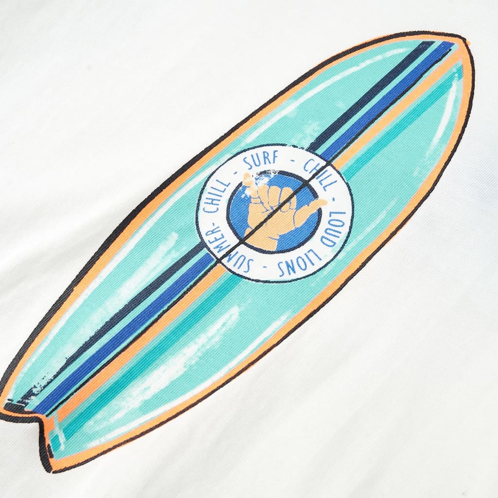 Esta t-shirt para criança possui mangas curtas, uma gola redonda e um corte a direito. A t-shirt para criança apresenta uma prancha de surf na parte da frente e é feita de 100% algodão, proporcionando um toque macio e confortável.