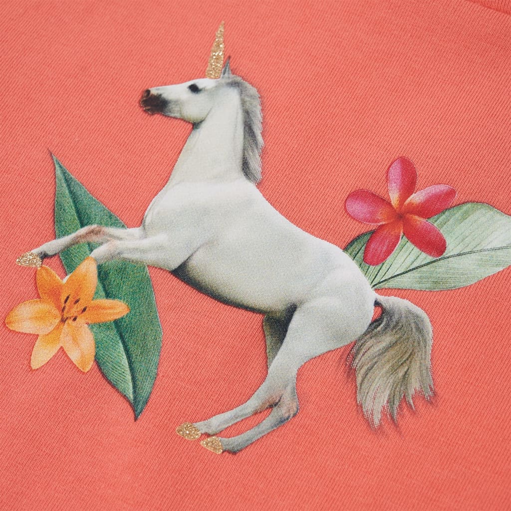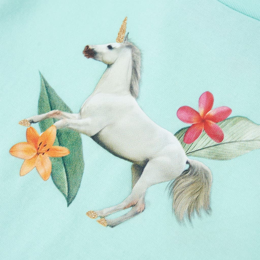 Esta t-shirt para criança possui mangas curtas com folhos, uma gola redonda e um modelo de corte reto. Esta t-shirt infantil apresenta um bonito unicórnio com folhas e flores. A t-shirt de manga curta infantil é feita de um material macio que inclui 95% algodão e 5% elastano, proporcionando conforto e respirabilidade.