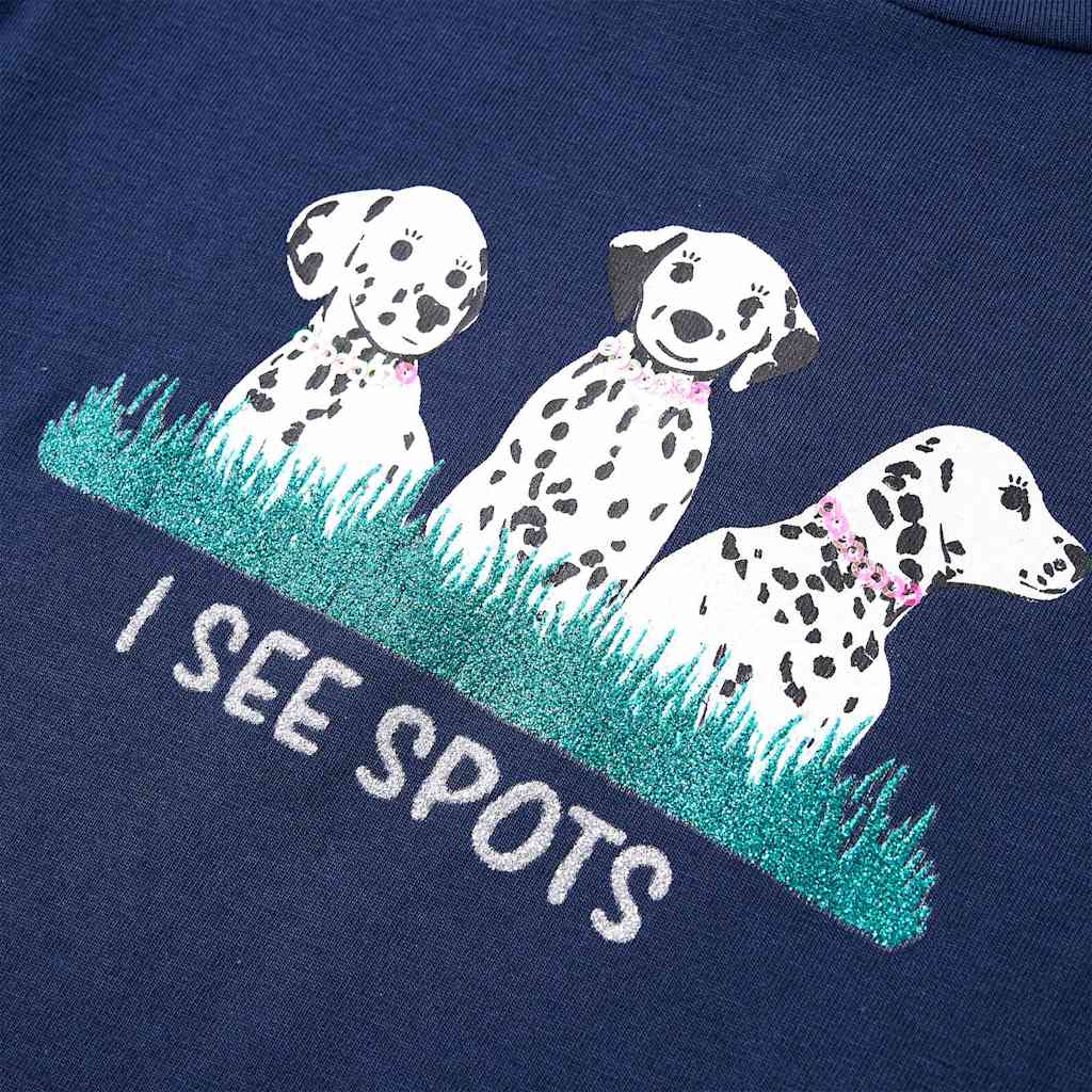 Esta t-shirt para criança possui mangas curtas, uma gola redonda e um modelo de corte reto. Esta t-shirt azul apresenta uma estampa de três cães e relva brilhante. A t-shirt de manga curta infantil é feita de um material macio com 95% algodão e 5% elastano, proporcionando conforto e elasticidade adicionais.
