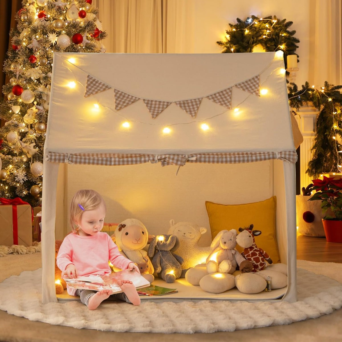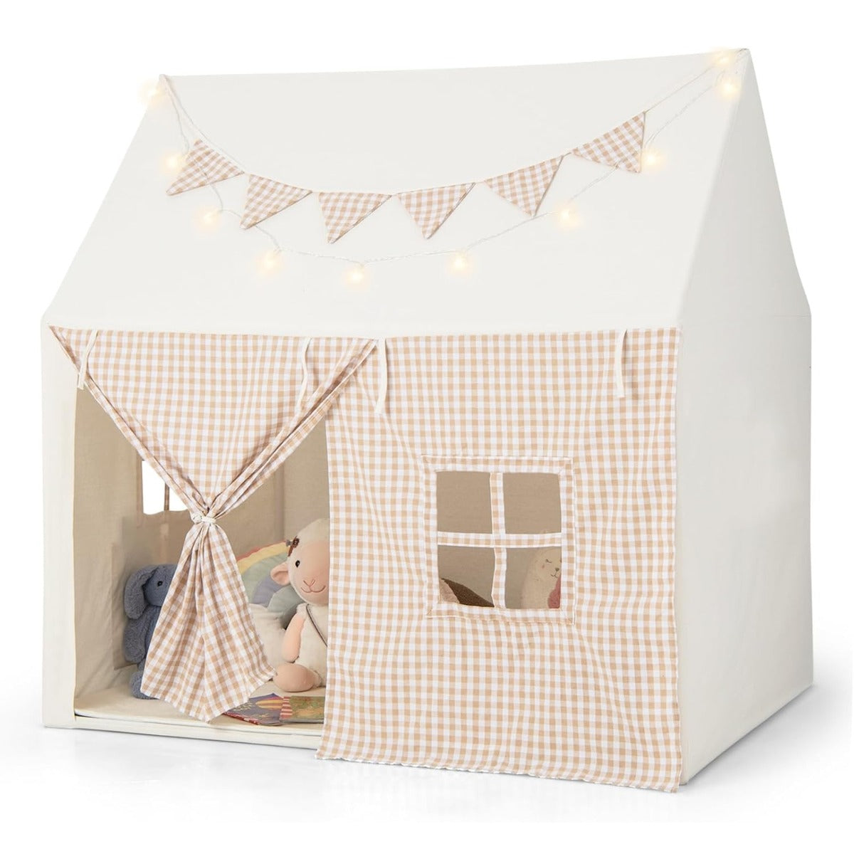 - Aspeto Versátil: Com o seu design encantador, esta casa de tendas de jogos é um presente ideal para crianças dos 3 aos 8 anos. As luzes brilhantes de estrelas (requerem 2 pilhas AA, não incluídas) e as bandeirolas retro xadrez acrescentam um toque de elegância. Seja como elemento decorativo em interiores ou para festas ao ar livre, esta tenda de jogos é um complemento perfeito.