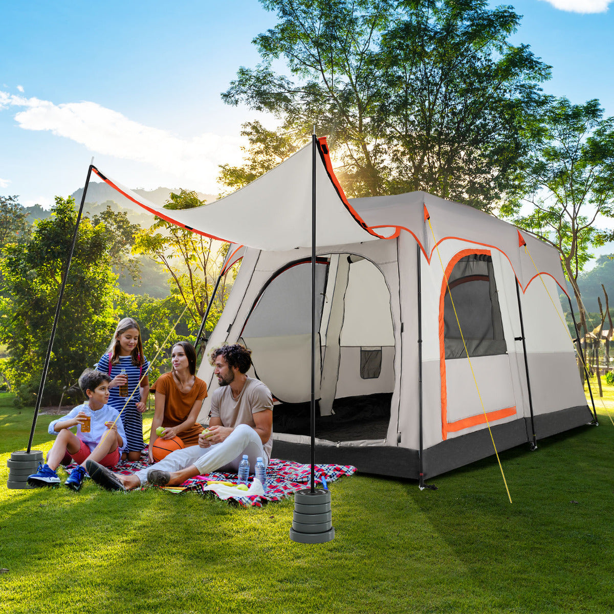 Desfrute de uma experiência de acampamento espaçosa e privada com a sua família e amigos com a nossa ampla tenda para 6 pessoas! Com dimensões generosas de 323 x 211 x 189 cm (comprimento x largura x altura), esta tenda foi projetada com conforto e versatilidade em mente. Os 2 quartos com divisória proporcionam um amplo espaço para várias atividades ao ar livre, desde emocionantes escapadelas de fim de semana até aventuras de caminhada e vibrantes festivais de música.