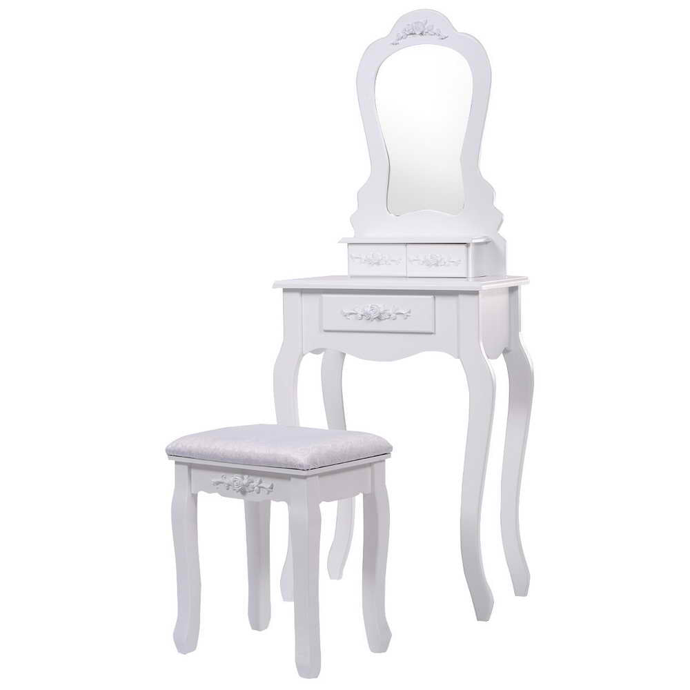 - Com suas formas claras e design bonito, o tocador de maquilhagem é uma mesa perfeita para o seu quarto. Prático e bonito, a sua cor branca adapta-se a qualquer estilo de quarto. O banco é confortável e poupa a sua energia. A mesa não é grande, mas é suficiente para uma pessoa. Além disso, é muito fácil de instalar de acordo com as instruções.